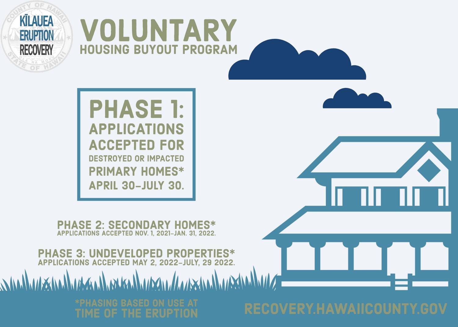 ๐๐ช๐ณ๐ด๐ต ๐ฑ๐ฉ๐ข๐ด๐ฆ ๐ฐ๐ฑ๐ฆ๐ฏ ๐ต๐ฐ ๐ช๐ฎ๐ฑ๐ข๐ค๐ต๐ฆ๐ฅ ๐ฑ๐ณ๐ช๐ฎ๐ข๐ณ๐บ ๐ณ๐ฆ๐ด๐ช๐ฅ๐ฆ๐ฏ๐ค๐ฆ๐ด Press Release - The County of Hawaiโi will begin accepting applications for the first of three phases of the Kฤซlauea Disaster Recovery Voluntary Housing Buyout Program (VHBP) on April 30. Phase 1 addresses properties that were used as a primary residence at the time of the 2018 eruption. Eligible properties for the VHBP must have been impacted by the disaster, whether by inundation or isolation, damage by fires caused by lava, or secondary effects of volcanic activity, such as heating or gases. Applicants must have owned the property at the time of the eruption. The following is the application timeline for the three phases: Phase 1 (primary residences) April 30, 2021, through July 30, 2021 Phase 2 (secondary residences) Nov. 1, 2021, through Jan. 31, 2022 Phase 3 (undeveloped properties) May 2, 2022, through July 29, 2022 Phasing is based on use of the property at the time of the eruption. Late applications will be processed during subsequent phases. Time between each phaseโs application period will be used by staff to process applications and submit buyout offers to qualifying applicants. The application form can be downloaded from the Countyโs Kฤซlauea recovery website โ recovery.hawaiicounty.gov โ starting April 30. Applications submitted before the appropriate phase start date wonโt be accepted. Applicants in need of a paper copy can contact the Kฤซlauea Disaster Recovery Division at (808) 961-8996 or kilaueabuyout@hawaiicounty.gov. The VHBP is funded with an allocation of $83.84 million from the U.S. Department of Housing and Urban Developmentโs (HUD) Community Development Block Grant-Disaster Recovery (CDBG-DR) program. Buyout offers will be based on the 2017 pre-eruption assessed market value with a limit of $230,000. The VHBP received strong support from residents who responded to the Countyโs Kฤซlauea Recovery Housing Survey. In total, more than 800 people completed the survey, with 77% reporting they are interested in a buyout as at least one of their options. A large majority of respondents (87%) said their property was inundated by lava; 34% received an insurance payout. The 2018 eruption on Kฤซlaueaโs Lower East Rift Zone destroyed 612 homes, including 294 primary residences. โThe 2018 eruption upended the lives of lower Puna residents, and many who lost a home are still needing help with finding secure, permanent housing,โ said Douglas Le, the Countyโs Kฤซlauea disaster recovery officer. โThis federally-funded program will help them get back on their feet and address an urgent need following the disaster while reducing risks from future eruptions.โ Applications from households that are low- to moderate-income will be given priority, although households of all income ranges are eligible to apply for this assistance. Acquired properties will be managed as open space, as required by HUD. Limited agricultural uses may be allowed. Additionally, the County is starting a Housing Relocation Services Program (HRSP), also funded by the CDBG-DR grant, on April 30 that will help income-qualified residents who were displaced by the eruption and do not have secure, permanent housing. Both property owners and long-term renters who were displaced by the 2018 eruption are eligible for this program. Services with HRSP include identifying rental properties, or properties for purchase, and providing financial assistance for costs to secure permanent housing, including security deposits for rentals and partial down payment assistance.