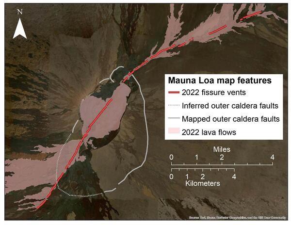 USGS-HVO — The recent 2022 Mauna Loa eruption began just before midnight, at 11:21 p.m. on November 27. The first caldera floor fissures were visible in webcams; however, the activity propagated south, outside of the view of the webcams, in the initial hours of activity. Official statements from the Hawaiian Volcano Observatory (HVO) noted that initial vents were within the caldera; however, lava flows were reported visible from Kona. Indeed, Kona residents could see lava flows descending the western flank of the volcano and were concerned, feeling that lava was outside of the caldera. In hindsight, it seems appropriate to explain what HVO knew in the first few minutes of the eruption and why Kona residents were able to see the first lava flows. Most people are familiar with Mokuʻāweoweo—the inner caldera at Mauna Loa. However, there's also an outer caldera, which is a geologic term indicating that less obvious mapped faults designate a much larger caldera feature than Mokuʻāweoweo. This is also true at Kīlauea. For example, most people think of the Kaluapele as the “giant crater” that Crater Rim Drive mostly encircles, but the outer caldera boundary of Kīlauea caldera extends north to the opposite side of Highway 11. When one drives past the entrance to Hawaiʻi Volcanoes National Park, they are driving within the outer caldera of Kīlauea! Mauna Loa’s southern outer caldera is buried under lava flows from the past centuries (see white dashed line on map). Three distinctive pit craters dominate this area from north to south: South Pit in Mokuʻāweoweo, Luahohonu, and Luahou. These pit craters are within the outer caldera, and not part of the Southwest Rift Zone (SWRZ). The western rim of the outer caldera coincides with the inner caldera—we have not found circumferential faults to the west. The white line on map indicates the northern, eastern, and southeastern portions of the outer caldera. The approximate boundary between the caldera and the SWRZ is where these circumferential cracks cross the rift zone. Fissures that cross these circumferential cracks would indicate that the eruption is migrating into a rift zone. Sometimes fissures run right up to the outer caldera boundary and then head in the opposite direction (as during eruptions in 1935, 1942, and 1984). This is an important concept because HVO stated that initial 2022 fissures were restricted to the summit area. Yet, overnight photographs from Kona showed lava flows descending the western slope—so how was this possible? Shouldn’t the lava be hidden from view by the western topographic edge of the caldera? HVO’s use of the phrase “summit region” may have caused confusion for some Kona residents who thought HVO was referring to the “inner caldera.” The flows seen from Kona were coming from 3 km (1.8 miles) of fissures in the south outer caldera. When lava is erupting from this area it is visible because there are no major caldera walls obscuring the view of the western flank. Later mapping revealed that 2 km (1.2 mi) of fissures extended from the outer caldera into the uppermost extent of the SWRZ, with minor lava being emitted from those fissures. In total, the 2022 eruption of Mauna Loa saw 8 km (5 mi) of fissures open across the central and southern outer caldera floor during the night of November 27–28. By the first eruption overflight at dawn on November 28, all fissures in the inner caldera, southern outer caldera, and the uppermost SWRZ had stopped erupting and were incandescent glowing cracks. A new set of fissures had begun to form on the Northeast Rift Zone (NERZ). The three lowest elevation fissures were erupting during the initial overflight and named fissure 1–3. Fissure 4 opened two days later, on November 29, 2022. In total, 17 km (11 mi) of fissures spanned the uppermost SWRZ, the southern and central outer caldera, and the NERZ during the 2022 eruption of Mauna Loa. ---- Image and caption by USGS-HVO: Map of the Mauna Loa 2022 eruptive fissures, shown as red lines. Red shaded area indicates lava flows produced during the eruption, around the fissure vent areas. Solid white line indicates mapped outer caldera boundary. White dotted line indicates inferred outer caldera boundary that is buried by historic Mauna Loa lava flows. Fissures on map were documented by C. Parcheta at USGS; lava flow polygons by USGS National Civil Applications Center. ---- Volcano Watch is a weekly article and activity update written by U.S. Geological Survey Hawaiian Volcano Observatory scientists and affiliates.