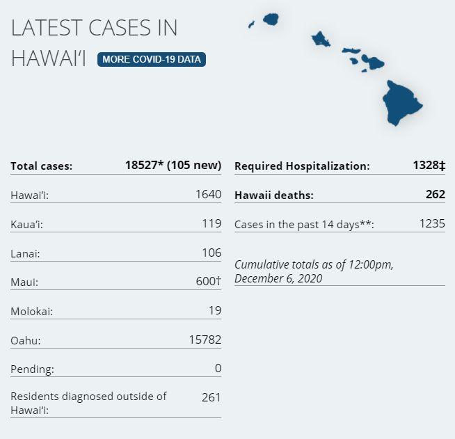5 new cases on island via Hawaii DoH. There have been a total of 1,640 (+5) confirmed cases on Hawaiʻi Island according to DoH. There has been 100 cases on island in the last two weeks. 2 currently hospitalized on the island (HCCD). Hawaii Island Deaths Total: 49 (0) – "7 community at the Hilo Medical Center, 4 community at the Kona Community Hospital, 10 from Life Care Center, per their website, 27 from the Yukio Okutsu State Veterans Home." (HMC, Life Care Center). One fatality is outstanding from classification. 7-day average on test positivity on island is at 1.0%, the state's positivity rate is now at 1.8%. On Friday, (12.4.20) there were 610 tests processed on island. 1,010 passenger arrivals on island Dec 3rd. The most passenger arrivals since March so far is 1,475 on Nov 21st, arrivals had a bump in the week before Thanksgiving, but has returned to levels seen since the Oct 15th pre-travel screening program began. STATE STATS: Total Cases Statewide: 18,527 (+105* today) Cases in the past 14 days: **1,235 Total Hospitalizations: 1,328 (+2) Total Deaths: 262 (+1) NOTE: Dept of Health on Big Island are at least a 1 month behind in processing deaths. DoH now lists 41 deaths of 49 reported by HCCD. There has not been a death reported on island in the last 3 weeks. *As a result of updated information, one case on Hawaii was removed from the counts. (DoH)