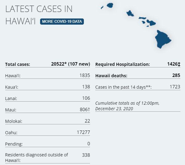 13 new cases on island via Hawaii DoH. There have been a total of 1,835 (+13) confirmed cases on Hawaiʻi Island according to DoH. There has been 171 cases on island in the last two weeks. 2 currently hospitalized on the island (HCCD). Hawaii Island Deaths Total: 50 – "7 community at the Hilo Medical Center, 4 community at the Kona Community Hospital, 10 from Life Care Center, per their website, 27 from the Yukio Okutsu State Veterans Home." (HMC, Life Care Center). Two fatalities are outstanding from classification. Dept of Health is two days behind on the 7-day average tracking of test positivity; on Dec 19th there was a positivity rate of 1.7% on island, and the state's positivity rate was at 2.8%. On Sunday, (12.20.20) there were 476 tests processed on island. 1,670 passenger arrivals on island Dec 21st. On the 19th there was 2,326 passenger arrivals, surpassing the previous record for most arrivals since the March and the start of the 14 days quarantine. Arrivals had a bump in the week before Thanksgiving, and are having another now before Christmas it appears. STATE STATS: Total Cases Statewide: 20,522* (+107 today) Cases in the past 14 days: 1,723 Total Hospitalizations: 1,426 (+13) Total Deaths: 282 (+3) NOTE: Dept of Health on Big Island are at least a 1 month behind in processing deaths. DoH now lists 44 deaths of 50 reported by HCCD.