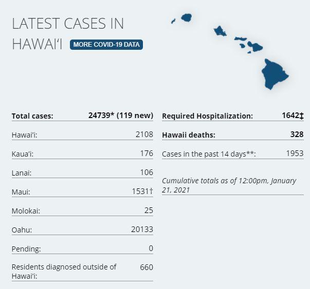 16 new cases on island via Hawaii DoH. There have been a total of 2,108 (+16 today) confirmed cases on Hawaiʻi Island according to DoH. There has been 144 cases on island in the last two weeks. 3 hospitalized on the island via last report (HCCD). Civil Defense has also stated that most of the recent cases have been travel related. Hawaii Island Deaths Total: 51 – "7 community at the Hilo Medical Center, 4 community at the Kona Community Hospital, 10 from Life Care Center, per their website, 27 from the Yukio Okutsu State Veterans Home." (HMC, Life Care Center). Three fatalities are outstanding from classification. Dept of Health is two days behind on the 7-day average tracking of test positivity; the latest positivity rate is at 1.4% on island, and the state's positivity rate is dropping, now at 2.5%. On Monday, (1.19.20) there were 531 tests processed in Hawaii County. 709 passenger arrivals on island Jan 18th. On December 26th there were 2,333 passenger arrivals, surpassing the previous record for most arrivals since the March and the start of the 14 days quarantine. Passenger arrivals have returned to levels close to those seen on the October 15th 'reopening' and the beginning of the pre-travel screening program. STATE STATS: Total Cases Statewide: 24,739 (+119* today) Cases in the past 14 days: 1,953 Total Hospitalizations: 1,642 (+22) Total Deaths: 328 (+4) NOTE: Dept of Health on Big Island are at least a 1 month behind in processing deaths. DoH now lists 45 deaths of 51 reported by HCCD.