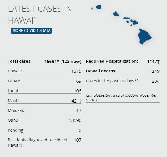 21 new cases on island via Hawaii DoH and HCCD. There have been a total of 1,356 (+21) confirmed cases on Hawaiʻi Island according to DoH. Currently there are 356 active cases known. As of yesterday there were 11 hospitalized on the island (HCCD). Hawaii Island Deaths Total: 48 (0) – "7 community at the Hilo Medical Center, 4 community at the Kona Community Hospital, 10 from Life Care Center, per their website, 27 from the Yukio Okutsu State Veterans Home." (HMC, Life Care Center). Yesterday, 7-day average on test positivity on island was at 2.2%, the state's positivity rate is now at 2.3%. 835 passenger arrivals on island Nov 5th. STATE STATS: Total Cases Statewide: *15,572 (+100 today) Cases in the past 14 days: **1,244 (-10 net) Total Hospitalizations: 1,147 (+9) Total Deaths: 219 (0) *As a result of updated information, one case on Oahu and two cases on Hawaii were removed from the counts. **Using cases reported in the past 14 days provides a rough approximation of the number of cases currently meeting criteria for isolation. This proxy number for “active cases” resolves classification issues for cases unable to be reached or who are out of jurisdiction, for whom precise release from isolation date may not be possible to determine. It is also not influenced by lags in data entry.