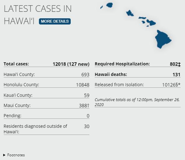 2 new cases via Hawaii DoH and HCCD, 7-day average on test positivity on island is slow decreasing, now at 1.3% (HDOH). There have been a total of 693 (+2) confirmed cases on Hawaiʻi Island according to DoH, with 91 (-67 net) active cases of COVID-19 implied. As of yesterday, HMC reported 15 hospitalized in Hilo with COVID-19; 4 in ICU, 10 in COVID Unit, and 1 in Extended Care Facility (via HMC FB). Hawaii Island Deaths Total via HCCD: 28 (0) The Hilo Veterans Home as of yesterday has 71 (0) residents and 34 (+1) employees test positive for COVID-19 (HMC). 26 deaths on island are related to the Yukio Okutsu State Veterans Home in Hilo. Total Cases Statewide: 12,018 (+127 today) Released from Isolation: 5,397 (+4,729) Total Required Hospitalization: 802 (+15) Total Deaths: 131 (+4) (DOH) NOTE: A significant amount of cases of cases were released from isolation