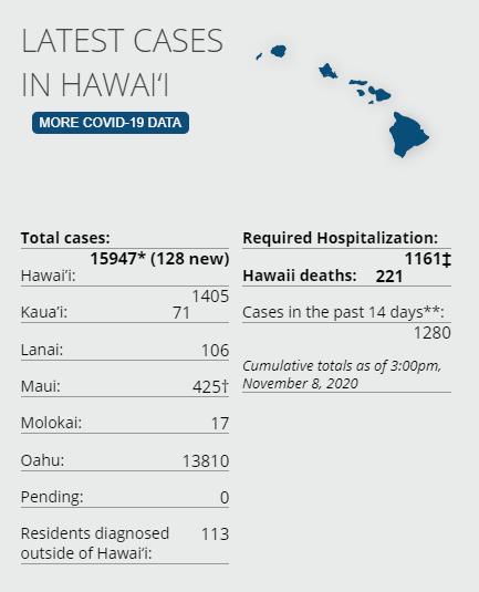 19 new cases on island via Hawaii DoH and HCCD. There have been a total of 1,405 (+19) confirmed cases on Hawaiʻi Island according to DoH. There have been 184 cases on island in the last two weeks. As of yesterday there were 10 hospitalized on the island (HCCD). Hawaii Island Deaths Total: 48 (0) – "7 community at the Hilo Medical Center, 4 community at the Kona Community Hospital, 10 from Life Care Center, per their website, 27 from the Yukio Okutsu State Veterans Home." (HMC, Life Care Center). Yesterday, 7-day average on test positivity on island was at 1.9%, the state's positivity rate is now at 2.4%. 835 passenger arrivals on island Nov 5th. STATE STATS: Total Cases Statewide: 15,947 (+128 today) Cases in the past 14 days: **1,280 Total Hospitalizations: 1,161 (+4) Total Deaths: 221 (+1) NOTE: Only 31 of HI's 48 deaths have been added to records by DoH, there is at least a 1 month delay. *As a result of updated information, a Hawaii resident diagnosed outside of Hawaii was recategorized to Oahu. **Using cases reported in the past 14 days provides a rough approximation of the number of cases currently meeting criteria for isolation. This proxy number for “active cases” resolves classification issues for cases unable to be reached or who are out of jurisdiction, for whom precise release from isolation date may not be possible to determine. It is also not influenced by lags in data entry. (DoH)