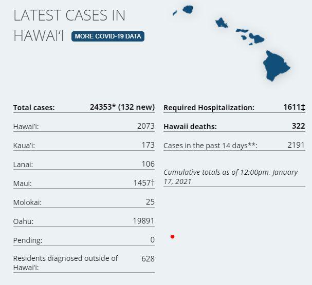 7 new cases on island via Hawaii DoH. There have been a total of 2,073 (+7) confirmed cases on Hawaiʻi Island according to DoH. There has been 151 cases on island in the last two weeks. 5 hospitalized on the island via last report (HCCD). Civil Defense has also stated that most of the recent cases have been travel related. Hawaii Island Deaths Total: 51 – "7 community at the Hilo Medical Center, 4 community at the Kona Community Hospital, 10 from Life Care Center, per their website, 27 from the Yukio Okutsu State Veterans Home." (HMC, Life Care Center). Three fatalities are outstanding from classification. Dept of Health is two days behind on the 7-day average tracking of test positivity; the latest positivity rate is at 1.6% on island, and the state's positivity rate is dropping, now at 2.6%. On Friday, (1.15.20) there were 545 tests processed in Hawaii County. 1,112 passenger arrivals on island Jan 14th. On December 26th there were 2,333 passenger arrivals, surpassing the previous record for most arrivals since the March and the start of the 14 days quarantine. Passenger arrivals have returned to levels close to those seen on the October 15th 'reopening' and the beginning of the pre-travel screening program. STATE STATS: Total Cases Statewide: 24,353 (+132* today) Cases in the past 14 days: 2,191 Total Hospitalizations: 1,611 (+7) Total Deaths: 322 (+2) NOTE: Dept of Health on Big Island are at least a 1 month behind in processing deaths. DoH now lists 45 deaths of 51 reported by HCCD
