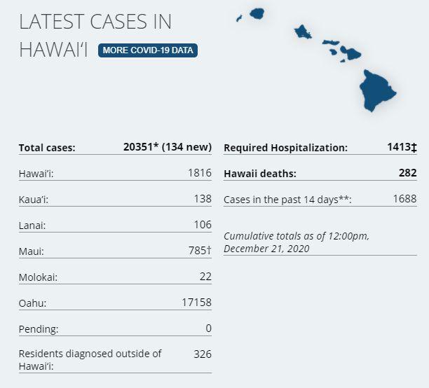 13 new cases on island via Hawaii DoH. There have been a total of 1,816 (+13) confirmed cases on Hawaiʻi Island according to DoH. There has been 164 cases on island in the last two weeks. 3 currently hospitalized on the island (HCCD). Hawaii Island Deaths Total: 50 – "7 community at the Hilo Medical Center, 4 community at the Kona Community Hospital, 10 from Life Care Center, per their website, 27 from the Yukio Okutsu State Veterans Home." (HMC, Life Care Center). Two fatalities are outstanding from classification. Dept of Health is two days behind on the 7-day average tracking of test positivity; on Dec 19th there was 1.8% on island, and the state's positivity rate was at 2.8%. On Saturday, (12.19.20) there were 585 tests processed on island. 1,661 passenger arrivals on island Dec 17th, surpassing the previous record (1,475 on Nov 21st) for most arrivals since the March and the start of the 14 days quarantine. Arrivals had a bump in the week before Thanksgiving, and are having another now before Christmas it appears. STATE STATS: Total Cases Statewide: 20,351* (+134 today) Cases in the past 14 days: 1,688 Total Hospitalizations: 1,413 (+1) Total Deaths: 282 (0) NOTE: Dept of Health on Big Island are at least a 1 month behind in processing deaths. DoH now lists 44 deaths of 50 reported by HCCD.