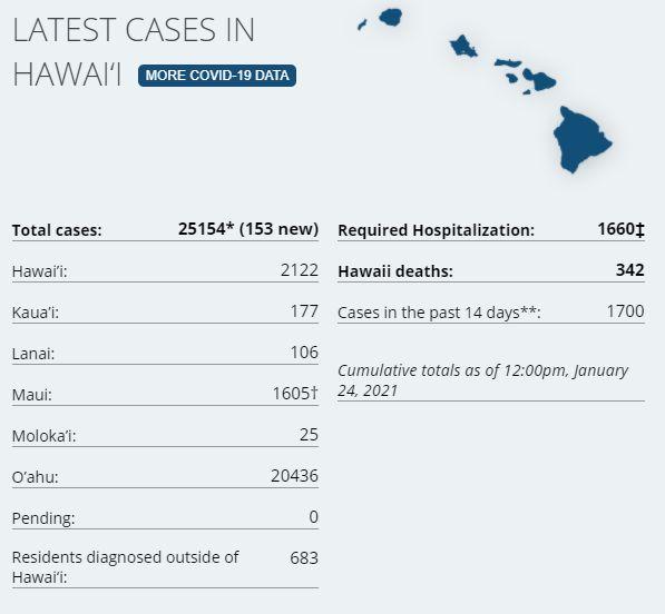 6 new cases on island via Hawaii DoH. There have been a total of 2,122 (+6 today) confirmed cases on Hawaiʻi Island according to DoH. There has been 116 cases on island in the last two weeks. 2 hospitalized on the island via last report (HCCD). Civil Defense has also stated that most of the recent cases have been travel related. Hawaii Island Deaths Total: 51 – "7 community at the Hilo Medical Center, 4 community at the Kona Community Hospital, 10 from Life Care Center, per their website, 27 from the Yukio Okutsu State Veterans Home." (HMC, Life Care Center). Three fatalities are outstanding from classification. Dept of Health is two days behind on the 7-day average tracking of test positivity; the latest positivity rate is at 1.2% on island, and the state's positivity is now at 2.4%. On Friday, (1.22.20) there were 519 tests processed in Hawaii County. 951 passenger arrivals on island Jan 21th. On December 26th there were 2,333 passenger arrivals, surpassing the previous record for most arrivals since the March and the start of the 14 days quarantine. Passenger arrivals have returned to levels close to those seen on the October 15th 'reopening' and the beginning of the pre-travel screening program. STATE STATS: Total Cases Statewide: 25,154 (+153* today) Cases in the past 14 days: 1,700 Total Hospitalizations: 1,660 (+3) Total Deaths: 342 (+6) * As a result of updated information, one case on Oahu and one case on the Island of Hawaii were removed from the count, and two cases on Oahu were recategorized to the Island of Hawaii. ~ DoH NOTE: Dept of Health on Big Island are at least a 1 month behind in processing deaths. DoH now lists 45 deaths of 51 reported by HCCD