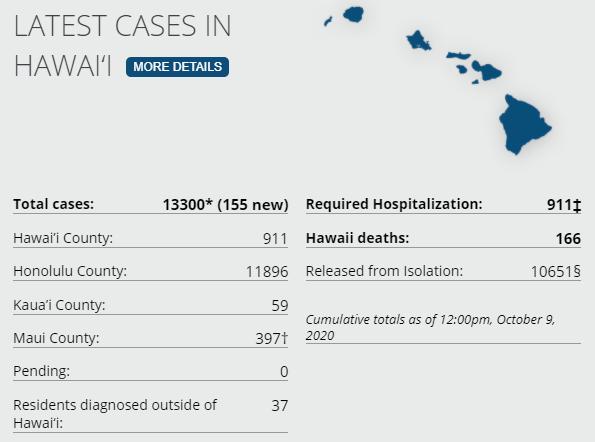 45 new cases via Hawaii DoH and HCCD. There have been a total of 911 (+45) confirmed cases on Hawaiʻi Island according to DoH, with 206 (+37 net) active cases of COVID-19 implied. As of yesterday, 7 are hospitalized at the Hilo Medical Center, 1 in the ICU, 6 in the COVID Unit. Hawaii Island Deaths Total via HCCD: 36 (+2) -- "27 from the Yukio Okutsu State Veterans Home and 6 community at the Hilo Medical Center, 2 from Life Care Center, per their website...." (HMC) One death has yet to be accounted for in this breakdown. A death of COVID-19 has been reported at Kona Community Hospital, where 2 additional patients are on ventilators in the ICU. ... 7-day average on test positivity on island is trending up, now at 3% (HDOH), the state 7-day avg is now 2.7%. Yesterday, Hawaii Island had 1,078 tests processed on island. Total Cases Statewide: 13,300 (+155 today) Released from Isolation: 10,651 (+47) Total Required Hospitalization: 911 (+11) Total Deaths: 166 (+2) *As a result of updated information, one case from Honolulu was removed from the counts. (DOH)