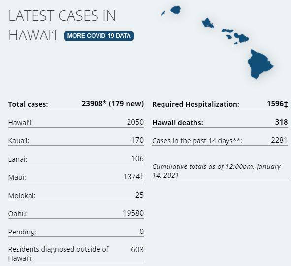 13 new cases on island via Hawaii DoH. There have been a total of 2,037 (+13) confirmed cases on Hawaiʻi Island according to DoH. There has been 163 cases on island in the last two weeks. 3 hospitalized on the island via last report (HCCD). Civil Defense has also stated that most of the recent cases have been travel related. Hawaii Island Deaths Total: 51 – "7 community at the Hilo Medical Center, 4 community at the Kona Community Hospital, 10 from Life Care Center, per their website, 27 from the Yukio Okutsu State Veterans Home." (HMC, Life Care Center). Three fatalities are outstanding from classification. Dept of Health is two days behind on the 7-day average tracking of test positivity; the latest positivity rate is at 2% on island, and the state's positivity rate is now 3%. On Tuesday, (1.12.20) there were 748 tests processed in Hawaii County. 767 passenger arrivals on island Jan 12th. On December 26th there were 2,333 passenger arrivals, surpassing the previous record for most arrivals since the March and the start of the 14 days quarantine. STATE STATS: Total Cases Statewide: 23,908 (+179* today) Cases in the past 14 days: 2,281 Total Hospitalizations: 1,596 (+16) Total Deaths: 318 (+6) *As a result of updated information, four cases on Oahu were removed from the counts. NOTE: Dept of Health on Big Island are at least a 1 month behind in processing deaths. DoH now lists 45 deaths of 51 reported by HCCD.