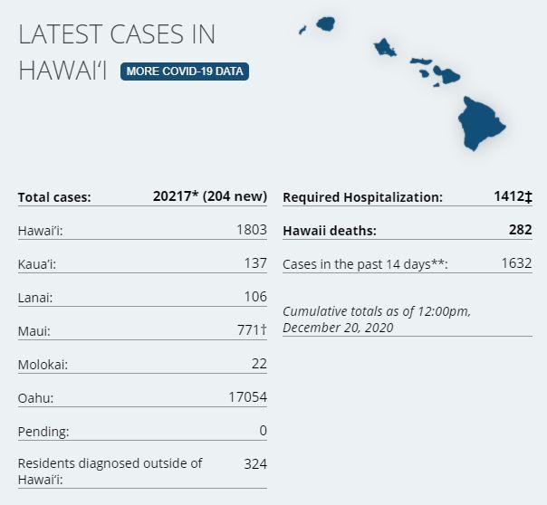 13 new cases on island via Hawaii DoH. There have been a total of 1,803 (+13) confirmed cases on Hawaiʻi Island according to DoH. There has been 164 cases on island in the last two weeks. 3 currently hospitalized on the island (HCCD). Hawaii Island Deaths Total: 50 (+1) – "7 community at the Hilo Medical Center, 4 community at the Kona Community Hospital, 10 from Life Care Center, per their website, 27 from the Yukio Okutsu State Veterans Home." (HMC, Life Care Center). Two fatalities are outstanding from classification. 7-day average on test positivity on island is at 1.8%, the state's positivity rate is now at 2.8%. On Friday, (12.18.20) there were 970 tests processed on island. 1,661 passenger arrivals on island Dec 17th, surpassing the previous record (1,475 on Nov 21st) for most arrivals since the March and the start of the 14 days quarantine. Arrivals had a bump in the week before Thanksgiving, and are having another now before Christmas it appears. STATE STATS: Total Cases Statewide: 20,217* (+204 today) Cases in the past 14 days: 1,632 Total Hospitalizations: 1,412 (+7) Total Deaths: 282 (+1) NOTE: Dept of Health on Big Island are at least a 1 month behind in processing deaths. DoH now lists 44 deaths of 50 reported by HCCD.