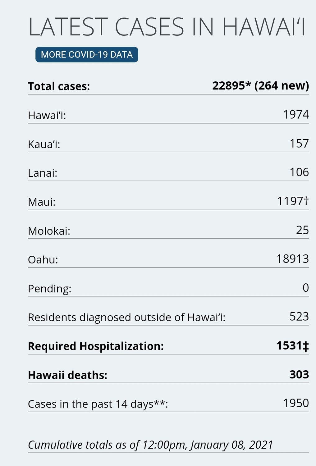 10 new cases on island via Hawaii DoH. There have been a total of 1,974 (+10) confirmed cases on Hawaiʻi Island according to DoH. There has been 119 cases on island in the last two weeks. 2 hospitalized on the island via last report (HCCD). Hawaii Island Deaths Total: 51 – "7 community at the Hilo Medical Center, 4 community at the Kona Community Hospital, 10 from Life Care Center, per their website, 27 from the Yukio Okutsu State Veterans Home." (HMC, Life Care Center). Three fatalities are outstanding from classification. Dept of Health is two days behind on the 7-day average tracking of test positivity; the latest positivity rate is at 1.9% on island, and the state's positivity rate is rising slowly to now 3.4%. On Wednesday, (1.6.20) there were 769 tests processed on island. 1,420 passenger arrivals on island Jan 7th. On December 26th there were 2,333 passenger arrivals, surpassing the previous record for most arrivals since the March and the start of the 14 days quarantine. Passenger arrivals have held steady following Christmas, perhaps being held at higher levels by the ongoing eruption of Kilauea. STATE STATS: Total Cases Statewide: 22,895 (+264 today) Cases in the past 14 days: 1,950 Total Hospitalizations: 1,531 (+10) Total Deaths: 303 (+4) NOTE: Dept of Health on Big Island are at least a 1 month behind in processing deaths. DoH now lists 45 deaths of 51 reported by HCCD.