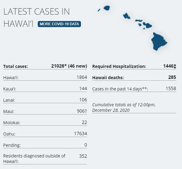 2 new cases on island via Hawaii DoH. There have been a total of 1,864 (+2) confirmed cases on Hawaiʻi Island according to DoH. There has been 132 cases on island in the last two weeks. 5 hospitalized on the island via last report (HCCD). Hawaii Island Deaths Total: 51 – "7 community at the Hilo Medical Center, 4 community at the Kona Community Hospital, 10 from Life Care Center, per their website, 27 from the Yukio Okutsu State Veterans Home." (HMC, Life Care Center). Three fatalities are outstanding from classification. Dept of Health is two days behind on the 7-day average tracking of test positivity; the latest positivity rate is at 1.4% on island, and the state's positivity rate was at 2.4%. On Saturday, (12.26.20) there were 237 tests processed on island. No updates since Dec 23rd to passenger arrivals, updated info expected tomorrow: 1,772 passenger arrivals on island Dec 23rd when last updated by DBEBT. On December 19th there were 2,326 passenger arrivals, surpassing the previous record for most arrivals since the March and the start of the 14 days quarantine. Arrivals had a bump in the week before Thanksgiving, and are having another before Christmas it appears. STATE STATS: Total Cases Statewide: 21,028* (+46 today) Cases in the past 14 days: 1,558 Total Hospitalizations: 1,446(+1) Total Deaths: 285 (0) NOTE: Dept of Health on Big Island are at least a 1 month behind in processing deaths. DoH now lists 44 deaths of 50 reported by HCCD. *As a result of updated information, one case on Oahu was removed from the counts.