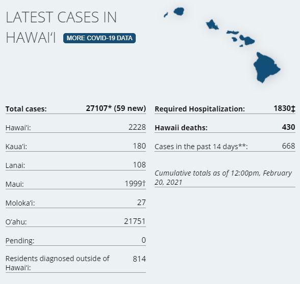2 new cases on island. Previously to Feb 15th, the last time there were no new cases in Hawaii County was on August 10th, 2020. There have been a total of 2,228 (2 new case today) confirmed cases on Hawaiʻi Island according to DoH, with 40 cumulative cases on island in the last two weeks. 1 person is hospitalized on the island via last report (HCCD). Hawaii Island Deaths Total: 53 – There have been no deaths reported in the last seven weeks, via HCCD. The latest positivity rate is at 0.5% on island, and the state's positivity is now at 1.1%. On Thursday, (2.18.20) there were 15 tests processed in Hawaii County.** 1,735 passenger arrivals on island Feb 18th. On December 26th there were 2,333 passenger arrivals, surpassing the previous record for most arrivals since March and the start of the 14 days quarantine. 1,929 Passenger arrivals on Feb 11th represents the most arrivals since the Christmas travel bump. STATE STATS: Total Cases Statewide: 27,107 (+59 today) Cases in the past 14 days: 668 Total Hospitalizations: 1,830 (+15) Total Deaths: 430 (0) ** Dept of Health is two days behind on the 7-day average tracking of test positivity. On Sundays and Mondays there are less tests processed than during the rest of the week.