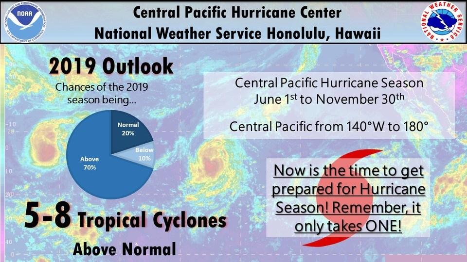 2019 Central Pacific Hurricane Season outlook just in from the National Weather Service Honolulu. There is a 70% chance of the season being above normal activity; 5-8 tropical cyclones are forecast for the region.