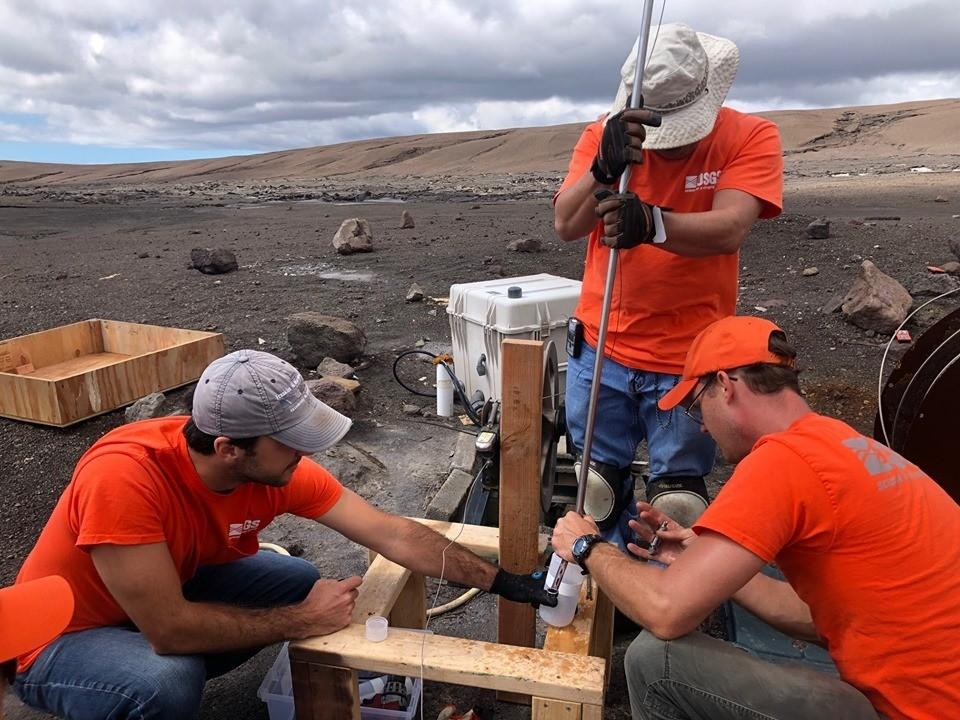 USGS-HVO Re-samples The Keller Well On The Edge Of The Kilauea Caldera, Nearest Well To The Halema'uma'u Crater Lake. HVO field engineers and staff conducted quarterly work at a deep borehole, known as the Keller Well, at the summit of Kīlauea Volcano today (Sept. 24). They lowered a sensor into the well to measure the distance between the ground surface and the top of the water table, which was 505 m (1657 ft) below the ground surface today. With a water pond at the bottom of Halema‘uma‘u, continued measurements at the Keller Well site provide important data on how the local water table is recharging the summit area following the 2018 collapse events. The HVO team also collected a sample of water from the well. Chemical analyses of the water will be conducted to determine and track changes in its composition. For more information about the Keller Well, please see HVO's Dec. 20, 2018, "Volcano Watch" article: https://volcanoes.usgs.gov/observatories/hvo/hvo_volcano_watch.html?vwid=1396 Images and caption by USGS-HVO, S. Warren Dane's Note: The Keller Well is the most relevant sampling site regarding the rising crater lake inside Halema'uma'u. The decades of USGS recording data at this deep borehole provides some insight on what could potentially happen with the new lake of water at the Kilauea Summit, like how big can expect it to get. The depth of water inside well varies over time, but the temperature is more constant at ~70degC, roughly the same temperatures as the water inside Halema'uma'u now. The lake inside Halema'uma'u now is roughly a football field in size (if you include one end-zone and a sideline) and over 30 ft deep. In a previous trip to the Keller Well following 2018 eruption, USGS found the water level to be 1,667 ft down (now at 1,657 ft), meaning in the year following the 2018 eruption the ground water level slightly risen ~10 ft, reversing the drop of the groundwater level observed after the eruption. Based on these measurements, and the depth of the Halema'uma'u collapse pit, I expect to water in the visible pool to continue to rise for months to come - until it reaches some equilibrium level with the water table. If this is the case, It's not close to halfway done filling yet as local ground water continues to recharge the summit area.