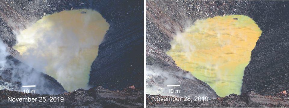 Update on the Developing Halema'uma'u Crater Lake From USGS-HVO (USGS-HVO, PHOTOS BY D. SWANSON) Measured from a vertical distance of about 603 m (1978 ft)—from water surface to the top of the tripod on the crater rim—the dimensions of the crater lake in Halema‘uma‘u were around 71-72 m (233-236 ft) north-south and 157-158 m (515-518 ft) east-west on November 28. The ongoing rise in water level is noticeable when the two photos, taken three days apart, are compared.