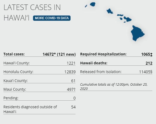 51 new cases on island via Hawaii DoH and HCCD. "The high numbers we are experiencing are concentrated in housing areas in North Kona and South Hilo Districts. These numbers reflect the ongoing testing policies to identify clusters of positive cases so they can be isolated and treated to prevent the spread of the virus." (HCCD) There have been a total of 1,221 (+51) confirmed cases on Hawaiʻi Island according to DoH, with 337 (+44 net) active cases of COVID-19 implied. As of yesterday there were 10 hospitalized on the island (HCCD). Hawaii Island Deaths Total: 44 (0) – "7 community at the Hilo Medical Center, 2 community at the Kona Community Hospital, 8 from Life Care Center, per their website, 27 from the Yukio Okutsu State Veterans Home." (HMC, Life Care Center). Four deaths at the Life Care Center have not been included in HCCD counts. 7-day average on test positivity on island is now at 3.4%, the state's positivity rate is now at 2.3%. Yesterday, Hawaii Island had 910 COVID-19 tests processed. (HDOH) Passenger arrivals coming to Hawaii island since Oct 15th started around 800 people a day, down to 473 passengers on Thursday. Total Cases Statewide: 14,672 (+121* today) Released from Isolation: 11,405 (+59) Total Required Hospitalization: 1,065 (0) Total Deaths: 212 (0) *As a result of updated information, one case from Honolulu and one case from Maui were removed from the counts. (DoH)