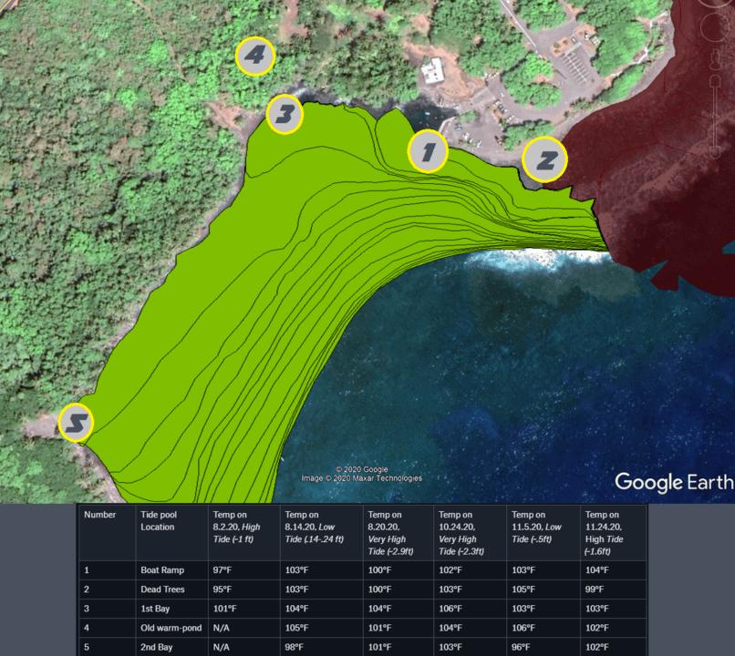 The newly formed tide pools at Pohoiki have increased in temperature in mid-2020, with springs as hot as 106°F. Post written with Philip Ong. The temperatures of the tide pools weren’t something I was monitoring previous to a few months ago, as the heat felt pretty consistent following the 2018 eruption of Kīlauea to those temperatures I remember prior. However, in early August I noticed a temperature difference on my visit following the park’s reopening after its first COVID-19 closure. The 2018 eruption of Kīlauea on the Lower East Rift Zone (LERZ) left lasting effects on the Lower Puna coastline, with over 3 miles of the “Red Road” that ran between Pohoiki and Kapoho covered by lava dozens of feet thick. Pohoiki is precariously positioned on the southern edge of lava flows that claimed the east side of the Issac Hale State Park (known as “Bowls” and “Shacks”). Following the end of the eruption, sand and rock driven by ocean currents inundated Pohoiki Bay, blocking the region’s only boat ramp with tons and tons of sediment. Sand accumulation created new tide pools along the old coastline that was previously exposed to the open ocean, now trapping heated spring water and forming several new natural volcanically-heated ponds. The thermally-heated, spring-fed tide pools have long been associated with the shoreline of Kīlauea, including one well known pond at Pohoiki (referred to here as the ‘Old Warm Pond’) that predates the eruption, and another at Ahalanui Beach Park. There has always been some temperature fluctuation in these tide pools depending on a few factors, including the tides and rainfall. However, the recent changes exceeded what could be expected in my own personal experience, as well as in the experience of those familiar with the area that have spoken with me. The ponds are notably hotter now, and have been consistently that way for a few months. The newly created warm ponds did not see significant changes for almost 2 years after the 2018 eruption of Kīlauea, with the temperature of the pools holding around or below the standard body temperature of 98.6°F. Starting in mid-2020, the ponds started to increase in temperature, and are now consistently measuring above 100°F, with the highest temperature I have recorded to date of 106°F at the surface above the springs. RESULTS Results in the attached table represents six field visits to Pohoiki to record temperature between August and November, 2020. There is still some fluctuation in temperatures in the ponds at Pohoiki on different days, which is consistent with how the temperature behaved before the eruption, and continues to do two years after the eruption. Tidal conditions for each sampling date are noted but do not seem to predictably affect the observations. A baseline temperature maximum of 98.6°F pre-temperature increase is sourced to USGS as “spring temperatures range to 37°C” (Janik, et al., 1994), personal experience, and is consistent with temperatures ascertained in conversation with people that frequent the area. DISCUSSION The data presented in the attached table does not capture the rise in temperature that we suspect occurred between May and early August, 2020, but it does show that the temperature has leveled off and held at temperatures well above those previously recorded by USGS. High and low tides do make for some variance in the surface temperature, but do not explain the general increase in temperature of the springs. To understand the reasoning behind the change in spring temperatures at Pohoiki we first examine what is known about the thermal springs along the coastline. “Springs along the coast from Pohoiki to Cape Kumukahi are a significant thermal anomaly with a surprising coherence that indicates there is a significant regional flow of thermal water that discharges along the coast (Janik et al., 1994).” “The warm springs downgradient from the lower ERZ do not contain thermal fluids like those found in the deep geothermal wells in the rift zone. Rather, their chemistry is that of diluted seawater except for silica and bicarbonate levels, and silica and chloride content increase with increasing temperature. A plausible explanation for the spring chemistry is that seawater in saturated rock below the freshwater lens south of the lower ERZ is heated to about 165°C, boils to 100°C and loses steam, and then mixes with the overlying freshwater lens and flows toward the shoreline, where it is further mixed with seawater from the ocean as it discharges.” (Janik et al., 1994, Scholl et al., 1995) In other words, the flow of spring water at Pohoiki predominantly consists of brackish salt-water. Chemical analysis prior to 2018 has shown a different signature from the groundwater sampled from wells within the East Rift Zone around Pāhoa, suggesting the springs at Pohoiki are fed by a separate water table which sits deeper underground and draws from heated, slow-moving sea-water on the south side of the East Rift Zone (Janik, et al., 1994). Water feeding the springs has been modeled to be roughly 18-20 years old based on tritium decay, and matches rainfall that came down up to the ~500ft elevation above Pohoiki based on deuterium and oxygen isotopes and collected rainfall data (Scholl et al., 1995). We suggest that the recent rise in heat at springs of Pohoiki is the effect of the volcanic eruption in 2018. After the eruption, temperatures of the tide pools did not immediately deviate noticeably from previous levels observed, even though the area has undergone significant geologic changes. Yet now, two years later a trend change arrives. Interestingly, the tritium decay models suggest that additional heat associated with the eruption is propagating through the brackish water faster than the water itself is moving through the ground. If our explanation is correct, we would expect the spring-water temperature at Pohoiki to remain at the recent elevated temperatures f