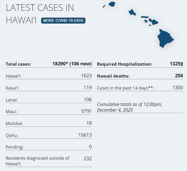 10 new cases on island via Hawaii DoH. There have been a total of 1,623 (+10) confirmed cases on Hawaiʻi Island according to DoH. There has been 111 cases on island in the last two weeks. 2 currently hospitalized on the island (HCCD). Hawaii Island Deaths Total: 49 (0) – "7 community at the Hilo Medical Center, 4 community at the Kona Community Hospital, 10 from Life Care Center, per their website, 27 from the Yukio Okutsu State Veterans Home." (HMC, Life Care Center). One fatality is outstanding from classification. 7-day average on test positivity on island is at 1.3%, the state's positivity rate is now at 1.7%. On Tuesday, (12.1.20) there were 797 tests processed on island. 679 passenger arrivals on island Nov 30th. The most passenger arrivals since March so far is 1,475 on Nov 21st, arrivals had a bump in the week before Thanksgiving, but has returned to levels seen since the Oct 15th pre-travel screening program began. STATE STATS: Total Cases Statewide: 18,290 (+106* today) Cases in the past 14 days: **1,300 Total Hospitalizations: 1,325 (+10) Total Deaths: 256 (+12) NOTE: Dept of Health has 7 more outstanding deaths on Hawaii Island in today's update, there is at least a 1 month delay processing deaths. DoH now lists 41 deaths of 49 reported by HCCD. *As a result of updated information, one case on Maui and one case on Hawaii were dropped from the counts. (DoH)