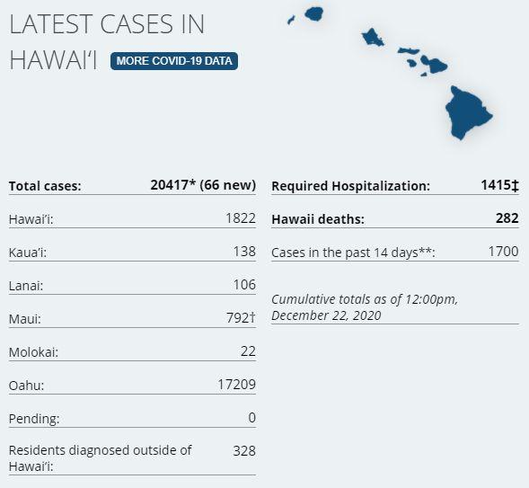 6 new cases on island via Hawaii DoH. There have been a total of 1,822(+6) confirmed cases on Hawaiʻi Island according to DoH. There has been 171 cases on island in the last two weeks. 2 currently hospitalized on the island (HCCD). Hawaii Island Deaths Total: 50 – "7 community at the Hilo Medical Center, 4 community at the Kona Community Hospital, 10 from Life Care Center, per their website, 27 from the Yukio Okutsu State Veterans Home." (HMC, Life Care Center). Two fatalities are outstanding from classification. Dept of Health is two days behind on the 7-day average tracking of test positivity; on Dec 19th there was a positivity rate of 1.7% on island, and the state's positivity rate was at 2.8%. On Sunday, (12.20.20) there were 476 tests processed on island. 1,948 passenger arrivals on island Dec 20th. On the 19th there was 2,326 passenger arrivals, surpassing the previous record for most arrivals since the March and the start of the 14 days quarantine. Arrivals had a bump in the week before Thanksgiving, and are having another now before Christmas it appears. STATE STATS: Total Cases Statewide: 20,351* (+66 today) Cases in the past 14 days: 1,688 Total Hospitalizations: 1,413 (+1) Total Deaths: 282 (0) NOTE: Dept of Health on Big Island are at least a 1 month behind in processing deaths. DoH now lists 44 deaths of 50 reported by HCCD.