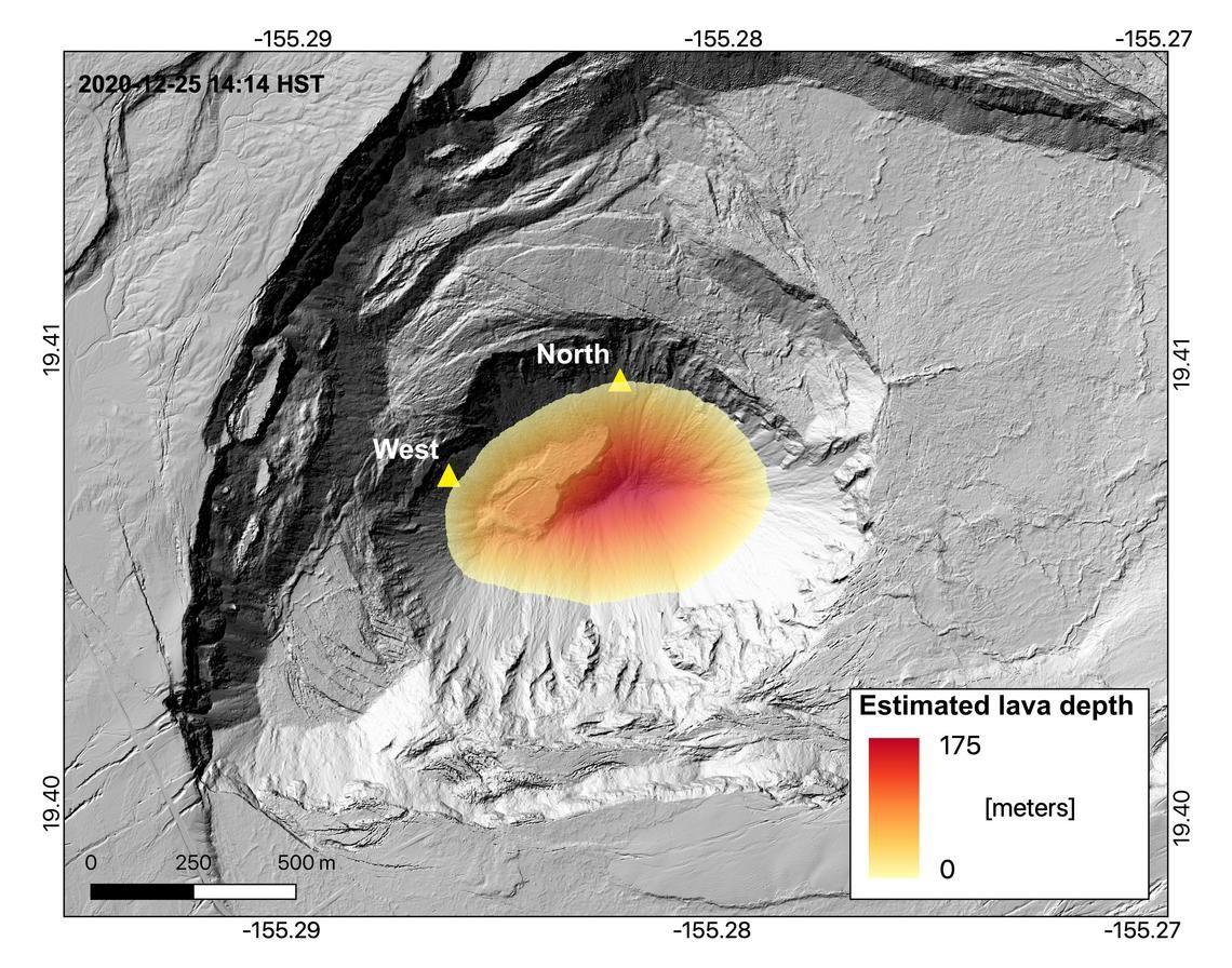 The eruption continues this morning in Halema‘uma‘u crater at Kīlauea's summit. The big change overnight happened around 2:40 a.m. when USGS crews noted that activity at the northern vent is down significantly and fountaining started back up at the western vent. Fountaining as high as 32 feet has been observed by USGS. It appears the northern vent got blocked by the lava lake and the pressure caused the western vent to start up again. The lava lake is now 583 feet deep, up 5 feet over the past 24 hrs. According to USGS this morning, the western vent is 111 feet above the lava lake at the moment. That means there is plenty of time for the western vent to fountain before it will get blocked by the lava lake. More information and updates to come. Latest from USGS Saturday Morning: Activity Summary: Lava activity is confined to Halemaʻumaʻu from two vents on the north and northwest sides of the crater. As of 2 pm yesterday, the crater lake was still 176 m (577 ft) deep and the lake level appeared to be 2 m (6 ft) lower leaving a narrow black ledge around the north edge. Early this morning, the west vent reactivated while the north vent quieted and started to drain the lake. Reduced SO2 emissions were measured last night. Summit Observations: Preliminary analysis of sulfur dioxide emission rates measured last night suggest that the rates have dropped to 16,000-20,000 tonnes/day. Summit tiltmeters continued to record slowing deflationary tilt until just before 3 am this morning (Dec. 26) when it switched to inflationary tilt. Seismicity remained elevated but stable, with a few minor earthquakes and tremor fluctuations related to the vigor of fissure fountaining. Halemaʻumaʻu lava lake observations: The north vent continued erupting lava into a lake within Halemaʻumaʻu crater. The west vent was incandescent until about 2:40 am this morning (nearly coincident with the switch from deflationary to inflationary summit tilt) when it became vigorously active with up to 3 narrow lava streams into the lake . After 3 am the north vent quieted and started to slowly drain lava from the lake. The lava lake within Halemaʻumaʻu crater remained about 176 m (577 ft) deep and about 415 m (1,360 ft) below the Halemaʻumaʻu rim as of yesterday afternoon (Dec. 25th). The lava lake volume remained about 21 million cubic meters (27 million cubic yards or 4.8 billion gallons). USGS field crews are currently making measurements to confirm whether the lake surface continues to drop. An island of cooler, solidified lava floating in the lava lake, which has been drifting slowly northeastward in the lake, has apparently grounded itself near the north vent. It is still about 260 m (850 ft) in length and 115 m (375 ft) in width based on the Dec. 23rd thermal map (https://www.usgs.gov/maps/december-23-2020-k-lauea-summit-eruption-thermal-map). At about 6 am this morning (Dec. 26), the island started to slowly drift to the southeast. Webcam views of the lava lake can be found here: https://volcanoes.usgs.gov/volcanoes/kilauea/multimedia_webcams.html Image 1 As of about 2:40 a.m. HST on December 26, 2020, activity at the west vent in Halema‘uma‘u crater wall at Kīlauea's summit has increased. This photo, taken at approximately 5:15 a.m. HST shows fountaining at the west vent, and lava pouring from the north end of the fissure into the growing lava lake. HVO field crews monitoring the activity overnight measured the west vent lava fountains as at least 10 m (32 ft) high. USGS photo H. Dietterich. Image 2 The eruption continues in Halema‘uma‘u crater at Kīlauea's summit. HVO field crews observing the activity overnight noted that at approximately 2:40 a.m. HST December 26, 2020, activity at the west vent in the wall of Halema‘uma‘u rejuvenated: the west vent has become more active than the northern vent. Since the start of the eruption on December 20 at 9:30 p.m. HST, the northern vent has been dominant and erupting more vigorously than the weaker western vent. Over the past two days, the northern vent has slowly been drowned by the rising lava lake, and this photo (taken at about 5:15 a.m. HST on Dec. 26) shows that the west vent is now erupting more vigorously. At 3:30 a.m. HST today (Dec. 26), HVO field crews measured the rising lava lake as 178 m (583 ft) deep. USGS photo by H. Dietterich. Image 3 (map) Lava lake level measurements collected during a field visit of Kīlauea Volcano's summit around 2:15 p.m. HST on December 25, 2020, were used to create a preliminary lava lake depth map. When compared to pre-eruption topographic models, it shows that the bottom of Halema'uma'u crater has been filled by almost 176 m (578 ft) of lava. Map by H. Dietterich. Image 4 Webcam image from this morning of Halemaʻumaʻu, lava lake, and down-dropped block [KWcam] From the west rim of the new summit collapse features