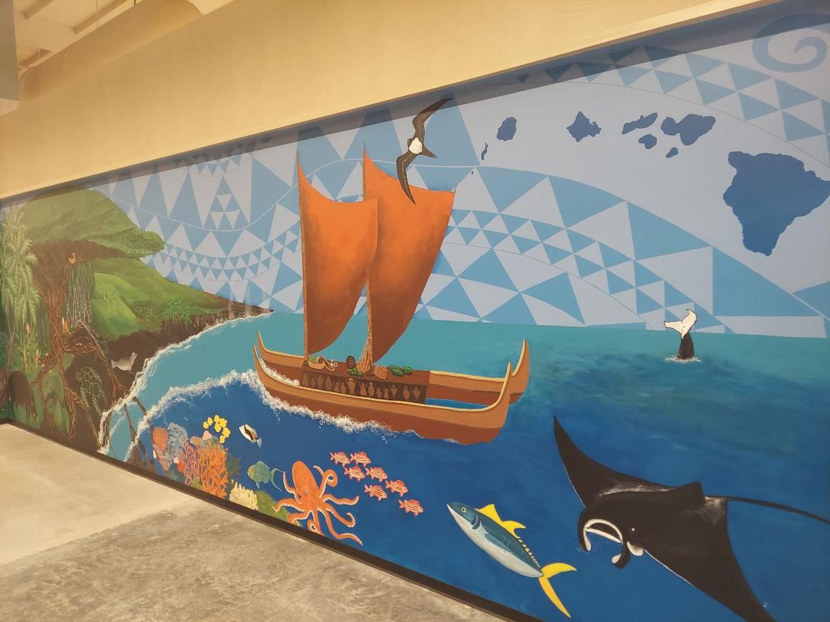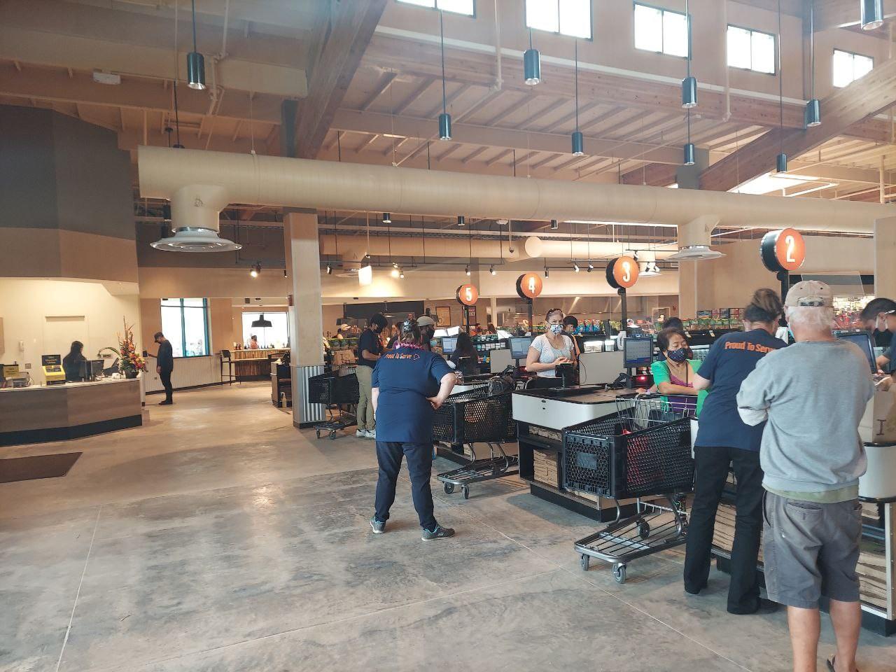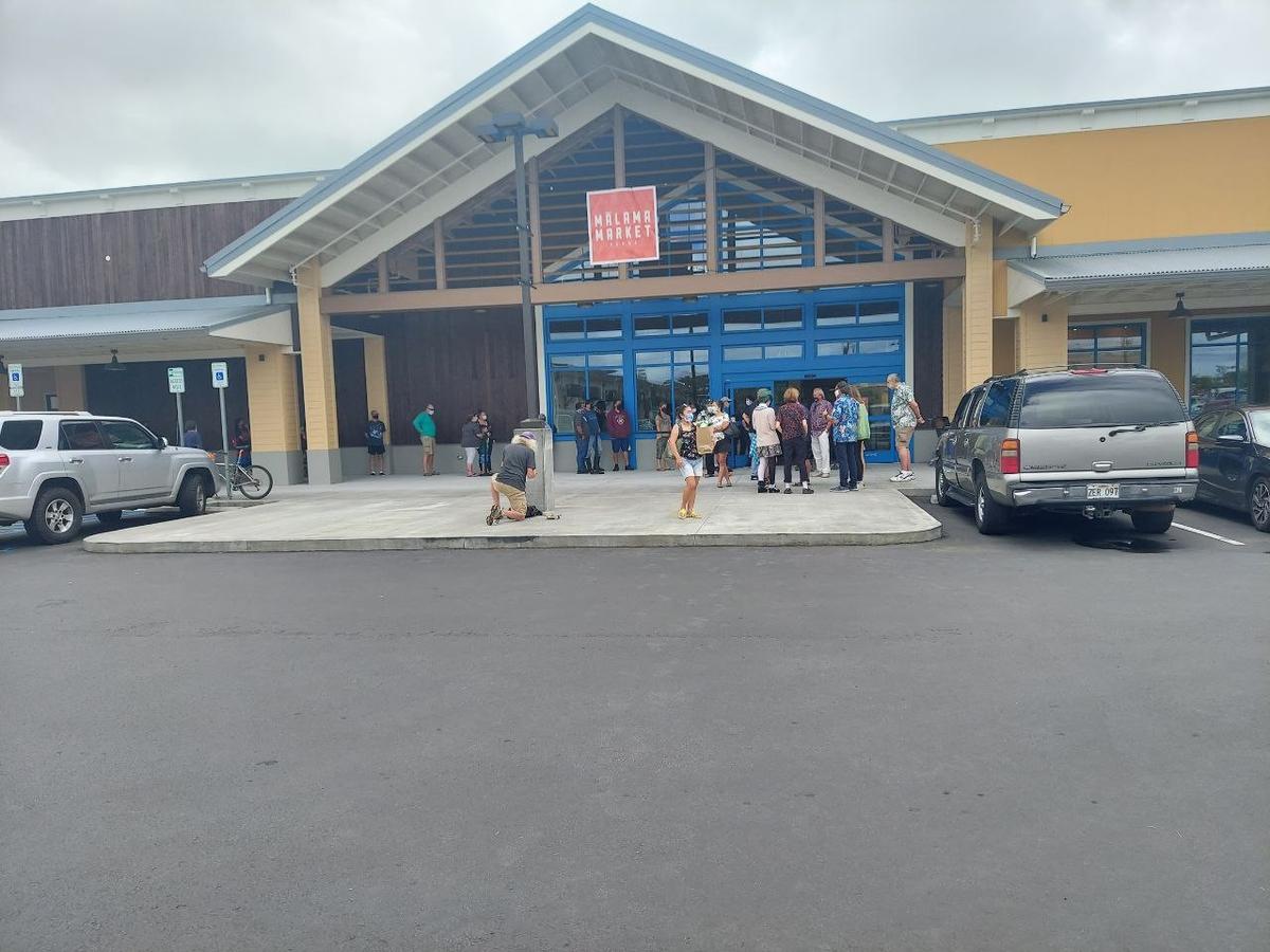 At 10am this morning Malama Market in Pahoa opened their doors in the new Puna Kai shopping center for the first time. Long lines formed as customers were eager to see the new establishment for the first time, and get some items they may have been low on after the one month closure of Pāhoa's largest supermarket. Inside there is a recently completed large 26ft hand-painted mural "O Wai Oe," meaning "who are you?" The mural was designed and completed by students and faculty of the Hawaii Academy of Arts & Sciences, directed by Shelby Smith. Malama Market has COVID-19 policies in place, including limiting the amount of customers and a mask policy.