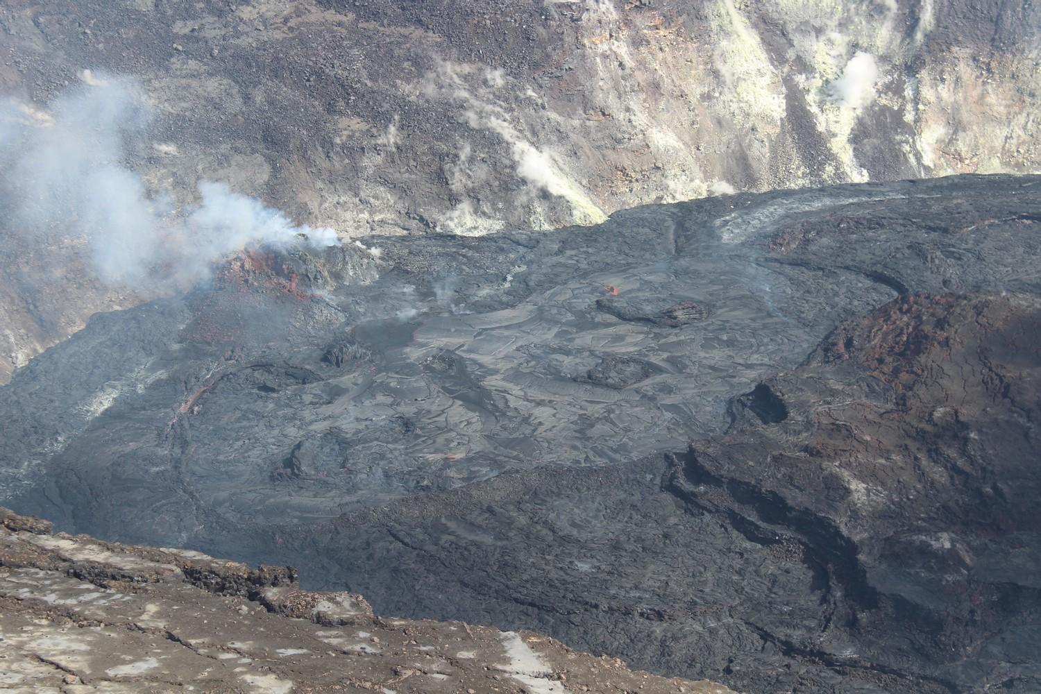 According to our estimates based on USGS photos, time-lapse sequences, and map area calculations, Kīlauea’s open lava lake surface has shrunk by close to 25% over the past week. Meanwhile, gas emissions have decreased by about half since last week, all while low lava output continues. There is still liquid lava below the newly crusted areas on the northeast and southwest lake margins, but it loses some volume as it cools, degasses and compresses, according to USGS-HVO. As a result, the recently stagnant surface now sits 7-10 ft (2-3 m) lower than the active lava surface nearby, which itself has slowed its rise to only ~1.6 ft (~0.5 m) during the past week, only to regain its previous depth of 227 m (745 ft). Latest on Kīlauea, Eruption Day 128, Week 18: -Active lake surface shrinking continues at the time of this writing; our estimates yield reductions of ~20% in the southwest and ~5% in the northeast, thus far. -Another Deflation-Inflation cycle begins today, after completing the third leg of a triple DI over the first half of the week. Possibly related, no ooze-up flows have been observed along the lake’s perimeter, next to the crater walls, during the past 2 weeks. -SO2 measurements from April 21-25: 350 tonnes/day, 550 t/d, 300 t/d, 350 t/d, 375 t/d (USGS), “among the lowest emission rates measured during the current eruption.” The single measurement during the previous week was 950 t/d on April 14, while the previous low measurements ranged around 500-600 t/d about one month ago, at the end of March. -GPS shows continued caldera spreading, with a possible increase in the extension rate following the slow-down over the past month. Seismic activity is still within background levels, and still focused mainly below the summit and South Flank. Join our weekly live video review of Kīlauea’s eruption! Broadcast at 5pm HST Tuesdays and archived, along with short video updates, on this channel - including monitoring signals, photos & videos, time-lapses, geologic context and annotation, and discussion of live viewer questions. #Kilauea2021 Image 1: This zoomed-in photo of the far southwest end of the active lava lake within Halema‘uma‘u at Kīlauea's summit was captured on Thursday, April 22, and it illustrates the process by which parts of the lava lake become inactive. This area, which had seen substantial lava circulation as recently as last week, now has a stagnant pāhoehoe crust that sits 2–3 m (7–10 ft) lower than the fluid lava surface just to the northeast (right). This crust overlies and possibly overhangs fluid lava underneath, as evidenced by the incandescence visible through a hole along the levee at left. The process starts when the circulation of surficial lava slows in a part of the lake—for reasons that are not entirely clear—allowing the pāhoehoe crust to form. At this point, the area is no longer replenished with new surface lava, and the underlying molten lava will actually contract due to degassing, compression, and cooling. The crust may remain attached to the levees, and as the lava underneath cools and contracts, voids can form below the crust. Eventually, deeper accumulation of molten lava may start lifting this area again, as has happened in the eastern end of the Halema‘uma‘u lava lake. USGS image & caption. Image 2: On Thursday, April 22, HVO scientists observed the ongoing eruption at the Kīlauea summit from the south rim of Halema‘uma‘u. This photo shows the active western portion of the lava lake, which appears to be in the process of shrinking again, with its northeast (upper-right) and southwest (lower-left) ends crusting over substantially. For scale, the distance from the western fissure (upper-left) to the nearest part of the main island in the lake (lower-right) is approximately 180 m or 590 ft. USGS image & caption.