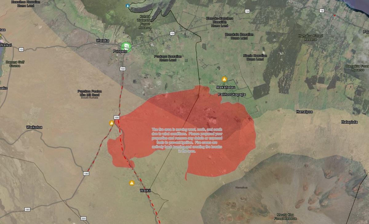 EDIT: Waikoloa Village Evacuation Issued by Hawaii County. "Please take immediate action and gather you personal items and evacuate." An evacuation center has been established at the old Kona airport. The wildfire has grown to over 36,000 acres and at least destroyed one home so far. Winds have helped spread the fire overnight. The National Weather Service has placed a wind advisory which includes the fire's parameter, with Northeast winds 15 to 30 mph and localized gusts over 50 mph expected. "The fire area is moving west, north, and south due to wind conditions. Please prepared your properties and remove any debris or exposed fuels to prevent ignition. Fire crews are actively back burning and creating fire breaks in the area." ~ Hawaii County Civil Defense A mandatory evacuation was issued yesterday (7.31.2021) for Pu'u Kapu Hawaiian Homestead and Waikii Ranch, no plans to evacuate Waikoloa have been made at this time. . An Emergency Proclamation has been signed by Hawaii County Mayor Mitch Roth. Highway 190 from Waimea Airport to the Waikoloa Road Junction and the Old Saddle Road are closed.