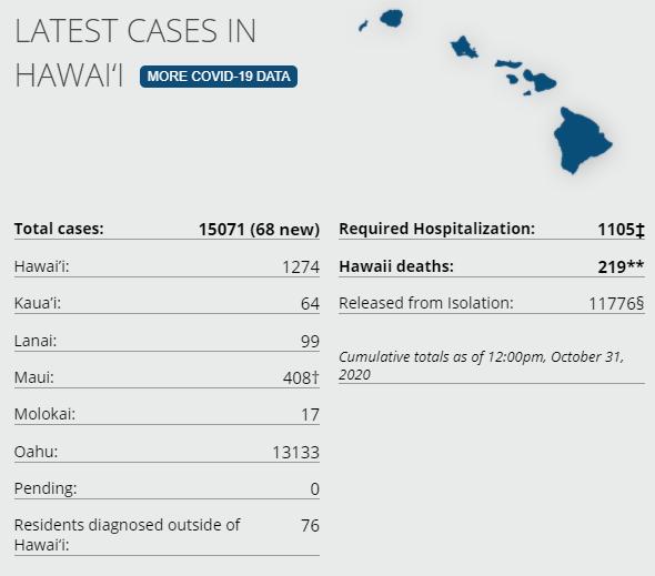 15 new cases on island via Hawaii DoH and HCCD. There have been a total of 1,274 (+15) confirmed cases on Hawaiʻi Island according to DoH, with 336 (+10 net) active cases of COVID-19 implied. As of yesterday there were 10 hospitalized on the island (HCCD). Hawaii Island Deaths Total: 46 (0) – "7 community at the Hilo Medical Center, 2 community at the Kona Community Hospital, 10 from Life Care Center, per their website, 27 from the Yukio Okutsu State Veterans Home." (HMC, Life Care Center). Six deaths at the Life Care Center have not been included in HCCD counts. 7-day average on test positivity on island is now at 2.1%, the state's positivity rate is now at 1.8%. On the 29th, the Hawaii Island had roughly 988 COVID-19 tests processed. (HDOH) Passenger arrivals coming to Hawaii island since Oct 15th started around 800 people a day, down to 576 passengers yesterday. Total Cases Statewide: 15,071 (+94 today) Released from Isolation: 11,776 (+38) Total Required Hospitalization: 1,105 (+8) Total Deaths: 219 (+3)