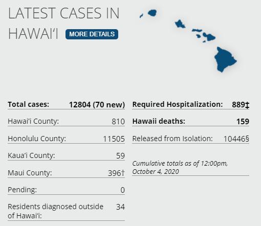 15 new cases via Hawaii DoH and HCCD. There have been a total of 810 (+15) confirmed cases on Hawaiʻi Island according to DoH, with 147 (+9 net) active cases of COVID-19 implied. Hawaii Island Deaths Total via HCCD: 30 (+1) As of yesterday, HMC reported 16 hospitalized in Hilo with COVID-19 (HCCD). There are no longer COVID patients at Yukio Okutsu now. Life Care center now has 12 residents test positive, and 6 staff. "The high increase of new cases is of great concern and demonstrates the critical need of following the preventive polices of face coverings, distancing, and gatherings. Much of this increase is due to clusters at the University of Nations in Kona and the Life Care Center in Hilo" ~ HMC 7-day average on test positivity on island is trending up, now at 2.6% (HDOH). Oct 3rd had 599 tests processed on island. Total Cases Statewide: 12,804 (+70 today) Released from Isolation: 10,446 (0) Total Required Hospitalization: 889 (+4) Total Deaths: 159 (+6) (DOH)