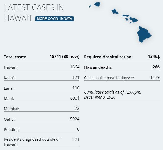 12 new cases on island via Hawaii DoH. There have been a total of 1,664 (+12) confirmed cases on Hawaiʻi Island according to DoH. There has been 96 cases on island in the last two weeks. 2 currently hospitalized on the island (HCCD). Hawaii Island Deaths Total: 49 (0) – "7 community at the Hilo Medical Center, 4 community at the Kona Community Hospital, 10 from Life Care Center, per their website, 27 from the Yukio Okutsu State Veterans Home." (HMC, Life Care Center). One fatality is outstanding from classification. 7-day average on test positivity on island is at 1.0%, the state's positivity rate is now at 1.8%. On Sunday, (12.6.20) there were 352 tests processed on island. 699 passenger arrivals on island Dec 8th. The most passenger arrivals since March so far is 1,475 on Nov 21st, arrivals had a bump in the week before Thanksgiving, but has returned to levels seen since the Oct 15th pre-travel screening program began. STATE STATS: Total Cases Statewide: 18,741 (+80 today) Cases in the past 14 days: **1,179 Total Hospitalizations: 1,346 (+17) Total Deaths: 266 (+4) NOTE: Dept of Health on Big Island are at least a 1 month behind in processing deaths. DoH now lists 43 deaths of 49 reported by HCCD, adding two more deaths recently. There has not been a death reported on island in the last 3 weeks.