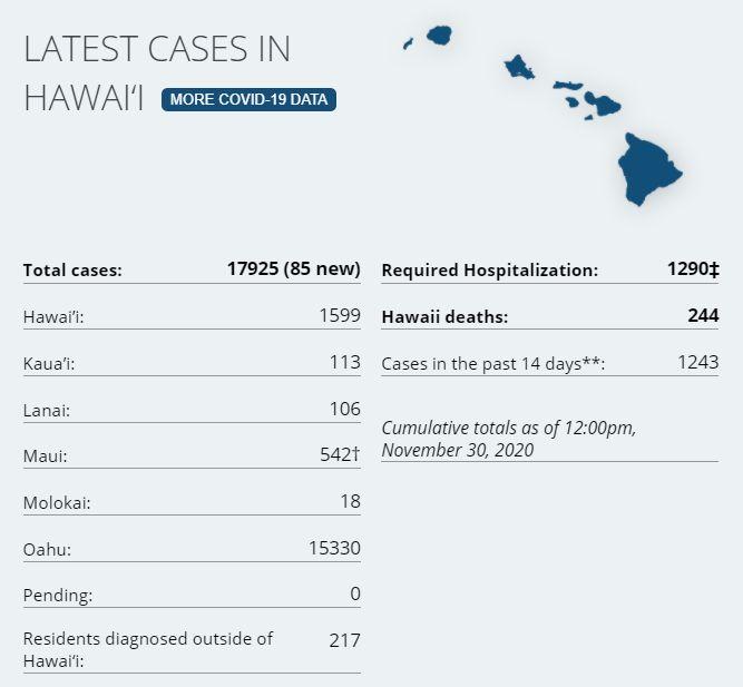 8 new cases on island via Hawaii DoH. There have been a total of 1,599 (+8) confirmed cases on Hawaiʻi Island according to DoH. There has been 119 cases on island in the last two weeks. 2 currently hospitalized on the island (HCCD). Hawaii Island Deaths Total: 49 (0) – "7 community at the Hilo Medical Center, 4 community at the Kona Community Hospital, 10 from Life Care Center, per their website, 27 from the Yukio Okutsu State Veterans Home." (HMC, Life Care Center). One fatality is outstanding from classification. 7-day average on test positivity on island is at 1.5%, the state's positivity rate is now at 1.7%. On Saturday, (11.28.20) there were 571 tests processed on island. 743 passenger arrivals on island Nov 26th. The most passenger arrivals since March so far is 1,475 on Nov 21st, arrivals have had a bump in the week before Thanksgiving but has returned to levels seen since the Oct 15th pre-travel screening program began. STATE STATS: Total Cases Statewide: 17,925 (+85* today) Cases in the past 14 days: **1,243 Total Hospitalizations: 1,290 (+2) Total Deaths: 244 (0) NOTE Dept of Health has listed 34 death on Hawaii Island, there is at least a 1 month delay processing deaths.