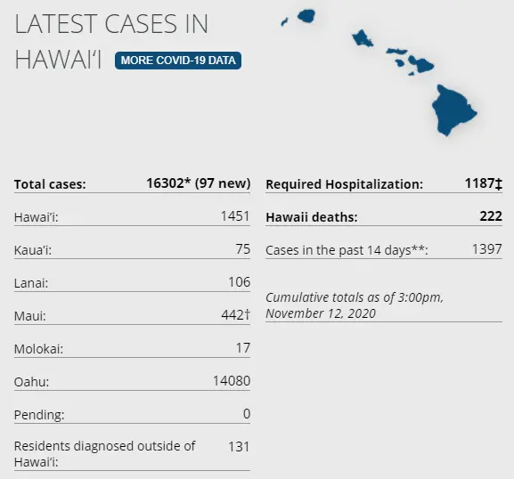 15 new cases on island via Hawaii DoH and HCCD. There have been a total of 1,451 (+15) confirmed cases on Hawaiʻi Island according to DoH. There have been 197 cases on island in the last two weeks. As of yesterday there were 12 hospitalized on the island (HCCD). Data from the Department of Health clearly shows that the majority of those now being affected on Hawaii Island are between the ages of 1 and 40 years and are West Hawaii based. (HCCD) Hawaii Island Deaths Total: 48 (0) – "7 community at the Hilo Medical Center, 4 community at the Kona Community Hospital, 10 from Life Care Center, per their website, 27 from the Yukio Okutsu State Veterans Home." (HMC, Life Care Center). Yesterday, 7-day average on test positivity on island was at 1.9%, the state's positivity rate is now at 2.3%. Yesterday there was 670 tests processed on island. 752 passenger arrivals on island Nov 11th. STATE STATS: Total Cases Statewide: 16,302 (+97 today) Cases in the past 14 days: **1,397 Total Hospitalizations: 1,187 (+2) Total Deaths: 222 (0) NOTE: Only 31 of HI's 48 deaths have been added to records by DoH, there is at least a 1 month delay. **Using cases reported in the past 14 days provides a rough approximation of the number of cases currently meeting criteria for isolation. This proxy number for “active cases” resolves classification issues for cases unable to be reached or who are out of jurisdiction, for whom precise release from isolation date may not be possible to determine. It is also not influenced by lags in data entry. (DoH)