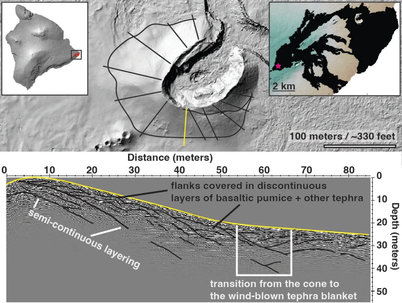 USGS Volcano Watch - In the last few months, "Volcano Watch" articles have introduced several research projects funded by the Additional Supplemental Disaster Relief Act of 2019 (H.R. 2157). Each of these projects will help scientists better understand how Kīlauea volcano works and how the 2018 lower East Rift Zone eruption and collapse of Kīlauea summit happened. Scientists from the USGS Hawaiian Volcano Observatory (HVO) and collaborators from the University of South Florida had the unique opportunity to get a peek at the layers inside Ahuʻailāʻau (the cone that formed around fissure 8) with ground penetrating radar (GPR) over the summer. GPR is a technique that uses small radar pulses to detect objects and changes beneath the ground. When these pulses are transmitted into the ground, they encounter things like faults or the boundary between different lava layers. They hit these obstacles and reflect back towards the surface, where they are captured by a receiving antenna. Unlike medical X-rays, GPR uses low-frequency radio waves no more powerful or harmful than those picked up by household radios. Essentially, GPR allows us to “see” inside of the cone in a way that does not damage it in the long-term. The transmitter and receiver are attached to a sled and guided along the ground surface and the data are collected in lines. We use different line directions and orientations to tie the lines together so we can get an idea of the layers beneath the surface in 3D. You may be wondering how deep into the cone we are able to see, and the answer to that question depends on two main things. The first is the wavelength of the energy we transmit with the GPR—the longer the wavelength, the larger the antennae size, and the deeper we can see. The second is the type of ground we run the survey on—very wet clays and soils generally make for poorer survey conditions, whereas dry and hard layers are better. Luckily, things like lava and tephra make for excellent survey conditions! We were able to image 50 feet (15 meters) into the cone for the Ahuʻailāʻau GPR survey using 100 megahertz (MHz) antennas. The data collected from GPR surveys are plotted on a “radargram.” Radargrams may look like modern art prints, but to the trained eye of a geophysicist these plots tell us a great deal about what is lurking beneath the surface. The main purpose of this GPR survey was to help HVO scientists better understand how cinder cones grow. The name “cinder cone” is a bit of a misnomer because features like Ahuʻailāʻau are not built entirely out of uniform piles of cinders. In fact, Ahuʻailāʻau is mostly basaltic pumice! Most cartoon drawings of cinder cones illustrate their insides like a multi-layered cake that slopes down and outwards from a central high point. Some of these layers are made of cinders (the cake), while others can be bits of lava that were still molten when they landed on the sides of the cone (the icing). As things like the fountain height and the wind direction change, so too do the thickness and location of the eruptive deposits. The pictured radargram shows that things are a little more complicated and not nearly as delicious as the simple sloped cake model. The upper part of the cone in this area is made mostly of tephra (fragments of lava that travel through the air before being deposited on the ground). These layers are variably thick and are not continuous down the flank of the cone. There is little spatter—globs of lava that stick together when they land—present, as well. Essentially, we have a very lumpy cake that lacks well defined layers and contains only a small amount of icing. The sections of the cone that bound the opening into the spillway contain a greater amount of spatter than the section shown in the radargram. Combining our survey results with monitoring data and other geophysical surveys allows us to understand how this prominent feature formed during the three-month-long eruption of Kīlauea’s lower East Rift Zone in 2018. We plan to share the results of this Ahuʻailāʻau survey after we complete the data processing. ---- Image and caption from USGS: The top panel shows a shaded relief map of Ahuʻailāʻau and the locations of the survey lines in black, with the radar line below highlighted in yellow. The lower panel shows an annotated radargram, noting where the GPR saw reflective boundaries in thicker black lines. These boundaries indicate layers of basaltic pumice and other tephra that are variably continuous and inconsistently thick. ---- Volcano Watch is a weekly article and activity update written by U.S. Geological Survey Hawaiian Volcano Observatory scientists and affiliates. This week’s article was written by National Science Foundation Postdoctoral Research Fellow Lis Gallant.