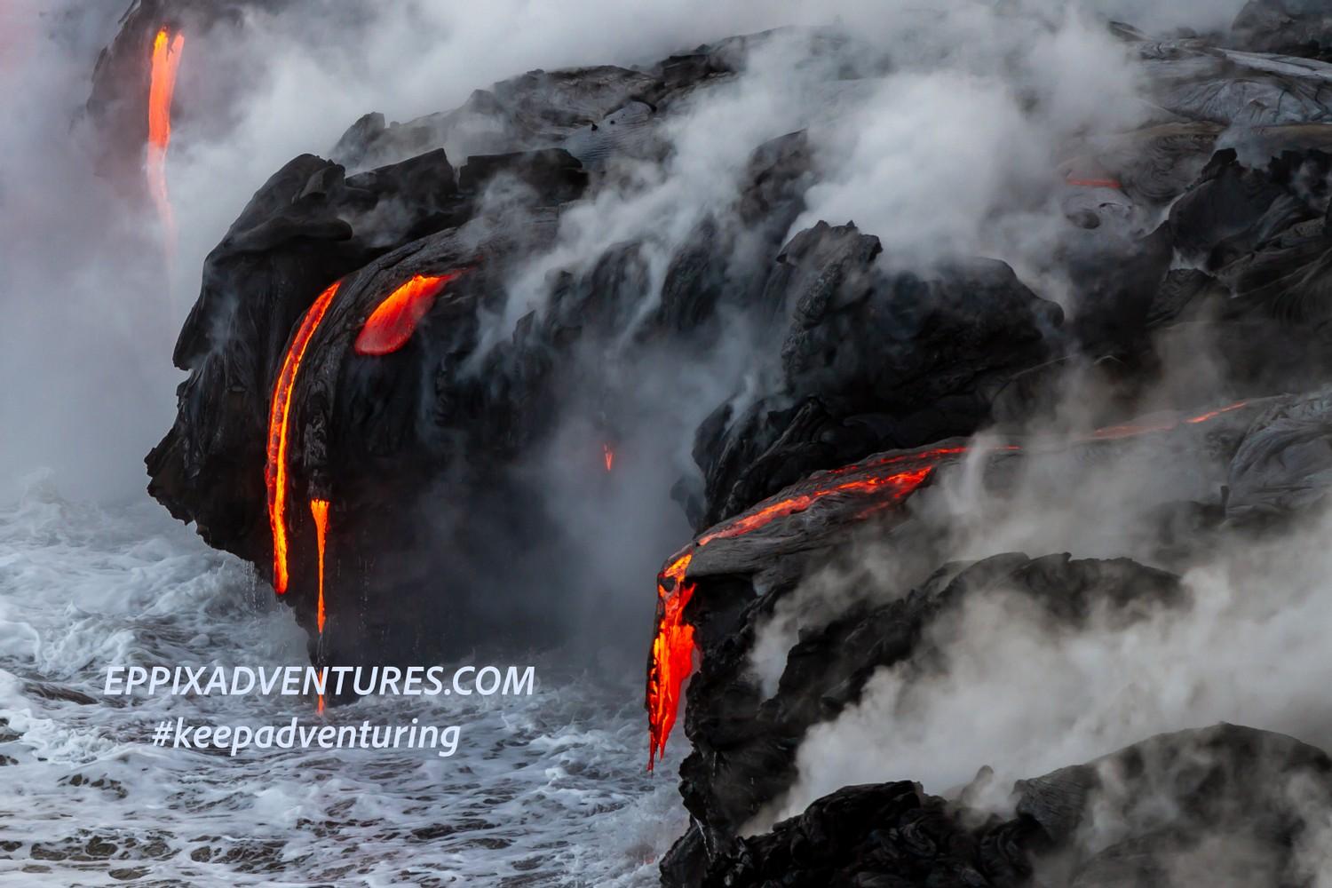 Lava makes many shapes as it moves and cools. Sometimes the shapes it creates in its molten form only lasts for seconds. Through photography we can capture those incredible moments in time and share them now and with generations to come. This ocean lava flow created an awesome shape of what appears to be an alien head and body which can be seen in the bottom right corner of the image. That unique shape lasted for only a couple of seconds and then had formed into something different. I love the contrast of the lava and lava rock against the daylight. The ocean and lava interacting with each other can be one of the most mesmerizing scenes at the volcano. This particular day there is no one else around but me to enjoy and absorb this incredible energy. I feel so lucky to be able to share with the world. Hope you enjoy my images. Picture taken at Kilauea’s lava cliffs, 5/25/13. -Warren Fintz