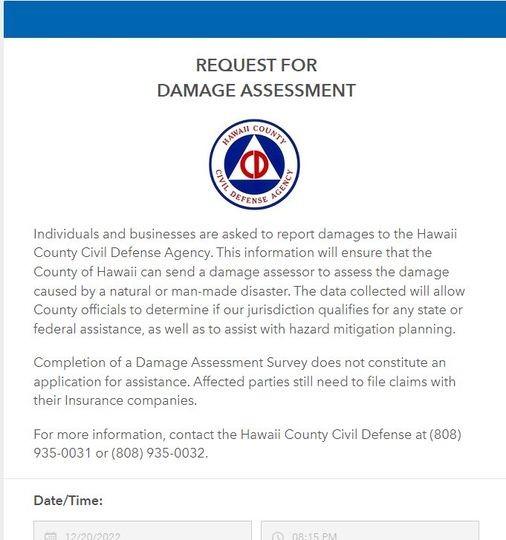 DAMAGE ASSESSMENT SURVEY - https://arcg.is/1b8CS1 Hawaii County Civil Defense - Individuals and businesses are asked to report damages to the Hawaii County Civil Defense Agency. This information will ensure that the County of Hawaii can send a damage assessor to assess the damage caused by a natural or man-made disaster. The data collected will allow County officials to determine if our jurisdiction qualifies for any state or federal assistance, as well as to assist with hazard mitigation planning. Completion of a Damage Assessment Survey does not constitute an application for assistance. Affected parties still need to file claims with their Insurance companies. For more information, contact the Hawaii County Civil Defense at (808) 935-0031 or (808) 935-0032.