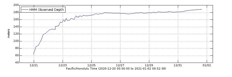 The lava lake inside Halema'uma'u continues to slowly rise at the summit of Kīlauea, fed by the ongoing effusion at the western fissure of the collapse pit. Here are the estimates on depth of the lava lake provided by USGS, and their handy-dandy range finder. - Dec 21: 289 feet deep - Dec 22: 440 ft - Dec 26: 577 ft - Dec 30: 597 ft - Dec 31: 593 to 608 ft deep, some fluctuations - January 1: 620 ft - Jan 2: 620 ft -- :HAWAIIAN VOLCANO OBSERVATORY DAILY UPDATE: -- January 2, 2020 Activity Summary: Lava activity is confined to Halemaʻumaʻu with lava erupting from vents on the northwest side of the crater. Early this morning (Jan. 2), the lava lake was 189 m (620 ft) deep with a narrow black ledge around it. SO2 emission rates were still elevated. Summit Observations: Sulfur dioxide emission rate measurements made Thursday (Dec. 31) were about 6300 t/d and in the range 3,000-6,500 t/d since Sunday (Dec. 27)--the same range of values that was common for the pre-2018 lava lake. Summit tiltmeters recorded weak deflationary tilt over the past day. Seismicity remained elevated but stable, with steady elevated tremor and a few minor earthquakes. East Rift Zone Observations: Geodetic monitors indicate that the upper portion of the East Rift Zone (between the summit and Puʻu ʻŌʻō) contracted while the summit deflated. There is no seismic or deformation data to indicate that magma is moving into either of Kīlauea’s rift zones. Halemaʻumaʻu lava lake Observations: The west vents spattered while erupting lava flowed through crusted-over channels into a lava lake within Halemaʻumaʻu crater. The lava lake was 189 m (620 ft) deep early this morning (Jan. 2). The most recent thermal map (Dec. 30) provided the lake dimensions as 800 by 530 m (875 by 580 yds) for a total area of 33 ha (82 acres). The narrow (10-30 m or 11-33 yd) ledge around the lake was about 1-2 m (1-2 yds) above the active lake surface (https://www.usgs.gov/maps/december-30-2020-k-lauea-summit-eruption-thermal-map). Over the past day, the main island of cooler, solidified lava floating in the lava lake drifted to the west before settling in front of the west lava source filling the lake around midnight, while the other 10 or so small islands remained relatively stationary around the east end of the lake. The main island measured about 250 m (820 ft) in length, 135 m (440 ft) in width, and about 3 ha (7 acres) in area based on the Dec. 30 thermal map. Measurements Friday afternoon (Jan. 1) showed that the island surface was about 6 m (20 ft) above the lake surface. Source: https://www.usgs.gov/volcanoes/kilauea/volcano-updates Images from USGS-HVO Image 1: The western fissure in Halemaʻumaʻu wall remains active. Glowing vents and a prominent spatter cone are visible in this photo, which shows some spattering at the vent. This view looks steeply down from Kīlauea's west caldera rim, and the lava lake surface is visible in the background. USGS photo by B. Carr on 12/31/2020. Image 2: Halema'uma'u at 1:30am this morning. Image 3: Graph showing the depth of the Halema‘uma‘u crater lava lake at Kīlauea Volcano's summit. HVO scientists measure the Kīlauea summit lava level using a small laser rangefinder mounted on a tripod. Measurements began one day after the start of the eruption on December 20, 2020 and are updated by geologists making observations from the field. HVO field crews use a laser range finder to measure the vertical distance between points of known elevation and the lava lake surface. Multiple measurements are taken and the average solution is plotted. Variations in plotted depth can occur due to alternating field crews, the uneven surface of the lava lake, or laser rangefinder returns on gas rather than the lake surface.