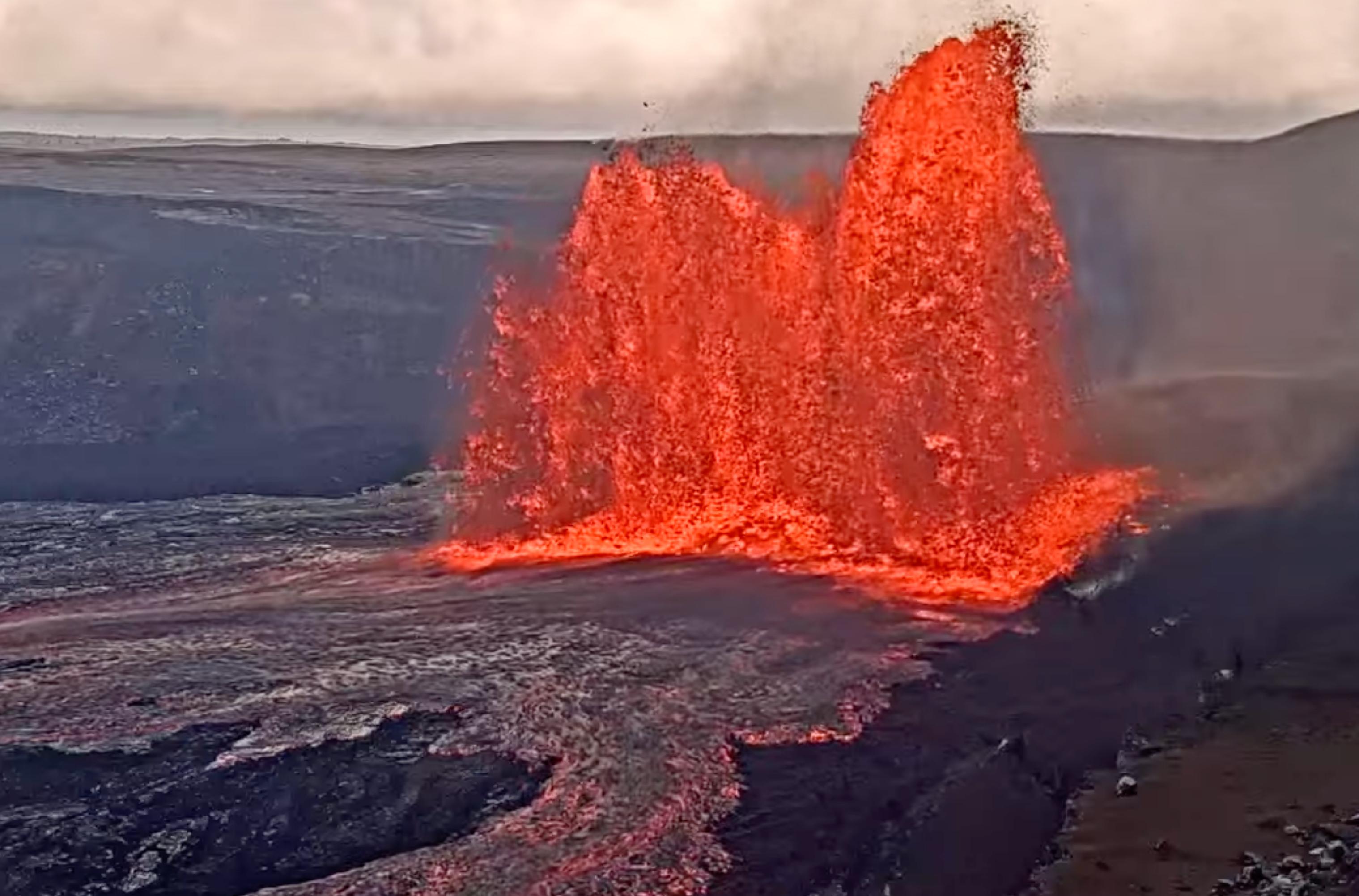 Episode 24 of the ongoing Halemaʻumaʻu eruption began at 8:55 PM HST on June 4 and is currently fountaining from the north vent. Episode 24 was preceded by sporadic spatter, gas pistoning, and hydrogen flames that began on the morning of June 3. At approximately 8:55 PM HST, episode 24 began with low dome fountaining accompanied by lava flows onto the crater floor. Small sustained lava fountains, less than about 100 feet (30 meters) high, began erupting from the north vent around 9:15 PM. Activity increased again around 10:10 PM, when fountain heights increased to 325 feet (100 meters) and by 10:40 reached over 980 feet (300 meters). Additionally, the fountain generated a plume that reached 16,500 feet (5,000 meters) above ground level by 10:50 PM and is increasing. At a tiltmeter near Uēkahuna (UWD), inflationary tilt reached just over 14 microradians since the end of the last episode; slightly more than the amount of deflationary tilt in episode 23. Seismic tremor began increasing and tilt at UWD switched from inflation to deflation at about 9:00 PM HST, close in time to the beginning of low fountaining. Most episodes of Halemaʻumaʻu lava fountaining since December 23, 2024, have continued for around a day or less and have been separated by pauses in eruptive activity lasting generally at least several days.