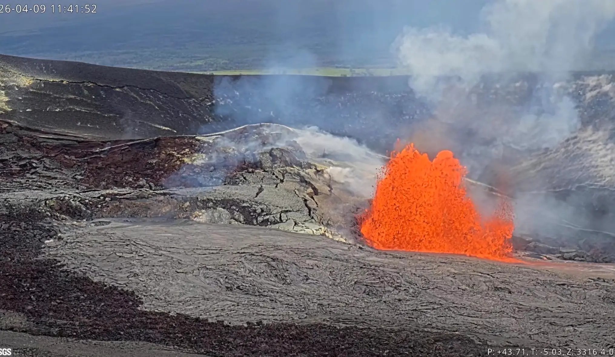 Kilauea Message 2026-04-09 11:36:36 HST. Lava fountains at the north vent in Halemaʻumaʻu are currently reaching about 35 meters (115 feet) in height, and they can be expected to reach maximum heights in 1–2 hours.