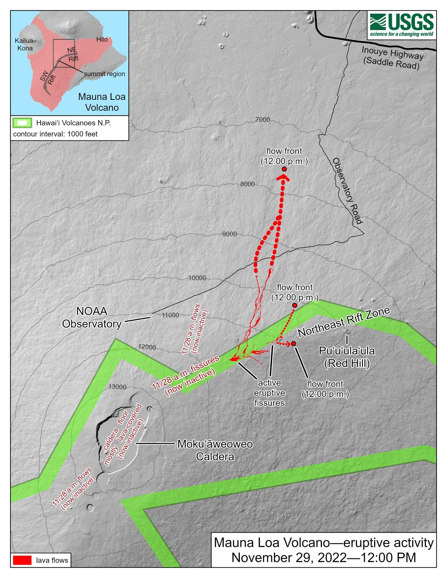 The Northeast Rift Zone eruption of Mauna Loa has continued into its second full day. At this time two fissures are active, sending lava flows in multiple directions. Overnight satellite views allowed USGS analysts to accurately map some of the most active flows, displayed in red here. Further downslope progression of the flows this morning is marked by dashed lines and points for the flow fronts at 12:00 p.m. today.
