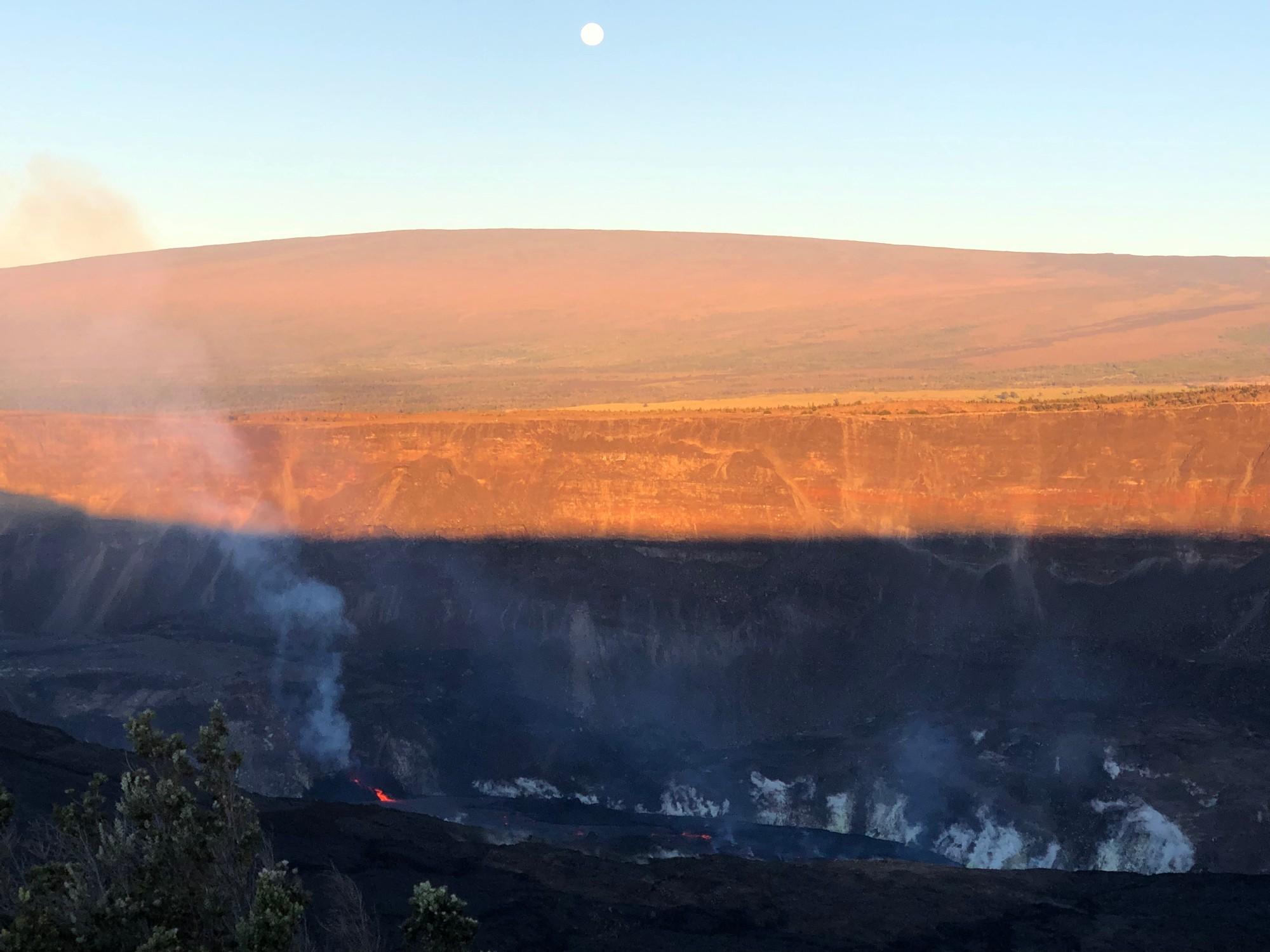 Halemaʻumaʻu at Dawn as Full Moon Sets Over Maunaloa