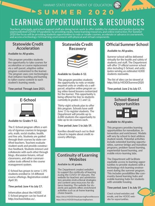 Hawai’i State Department of Education (HIDOE) today released an update regarding summer learning programs and meal services. Full press release: HIDOE announces summer school plans and supports for students as state transitions to Act with Care phase 19-May-2020 The Hawaii State Department of Education (HIDOE) today announced its summer programming will be delivered through multiple platforms including in-person and distance learning as well as mobile support for students and families. Traditional summer school programs will be done primarily via distance learning with some face-to-face options available for high-need students to comply with COVID-19 guidance from government and health officials. “The state’s transition from the ‘Safer at Home’ phase to this new ‘Act with Care’ phase comes at a time when our complex areas and schools are preparing for blended summer learning plans. The focus of our programs over the next two months is targeted toward our high-need and hard to reach students, with added opportunities for credit advancement for our secondary students,” Superintendent Dr. Christina Kishimoto said. “We are also assessing where we can expand on system and school design models that allow for continued distance learning opportunities into the fall including the permanent expansion of E-School programs and community-centric mobile learning labs.” Please see below for details about HIDOE’s summer programs. Summer School The Department will be rolling out a robust menu of expanded summer programming primarily via distance learning, as well as in-person where deemed necessary targeted toward high-need and hard to reach students. There are also opportunities for credit recovery, accelerating or advancing learning and credit attainment particularly for vulnerable learners within technology-rich learning environments. HIDOE's 2020 summer learning comprises five main program areas: statewide credit recovery, statewide credit acceleration, official summer school, E-School, and school-based opportunities. Of note, the credit-recovery program is being offered at no cost to families for students currently in grades 11 and 12. The Department will provide up to 6,000 students the opportunity to take up to six courses each. The Department also will offer virtual learning via 19 official summer school sites, and anticipates serving an estimated 4,000 students statewide. Mobile Learning Labs Mobile learning labs that provide WiFi access will be launched in four pilot locations in early June to assist students who were not fully proficient at the end of the 2019-20 school year toward advancement to their next grade level. Delivered learning will focus on English language arts/reading, mathematics, social studies and science. Pilot locations will focus on rural communities including Ka‘ū on Hawaii Island, Hāna on Maui, Molokai and Kauai, where connectivity and access are a challenge. The goal of this pilot is to transition from summer Mobile Learning Labs into permanent Micro Learning Hubs in the fall. This school design concept pushes student engagement into the communities and serves as hubs where authentic project-based learning, hands-on sustainability lessons, and applied arts can take place, while expanding WiFi access. YES Project HIDOE’s Education for Homeless Children and Youth office will pilot the YES Project on Oahu. The program will launch in mid-June with a bus that will travel to each district on Oahu once a week: Honolulu, Central, Leeward and Windward. This initiative will engage hard-to-reach students and families, provide basic necessities such as food and hygiene supplies, and deliver fun educational activities. It is meant to assess needs, gather data and serve as a bridge between schools and communities. Summer Feeding Program The Grab-and-Go school meals program will be extended by four days beyond the end of the school year through June 3. HIDOE will transition to its summer food service program, the Seamless Summer Option (SSO) on June 4. Currently, there are 35 participating public school sites that will be offering breakfast and lunch. Families are advised to verify if their school locations will be serving meals on June 4 before visiting. To help supplement the Department’s efforts, sponsor sites at public agencies, churches and nonprofit organizations will also serve meals to children at other locations throughout the summer. The HIDOE’s SSO program runs through July 17. [More info about the summer feeding program including list of participating schools at http://www.hawaiipublicschools.org/ConnectWithUs/MediaRoom/PressReleases/Pages/Grab-and-Go-meals-transitions-to-SSO.aspx] HIDOE Internships To support graduating seniors who might typically be participating in extracurricular activities, community-based learning, or part-time employment, HIDOE is working to provide a variety of summer internship opportunities within its state offices. The internships will provide a paid learning experience for recent graduates that are tied into Career and Technical Education areas of focus. Additional information will become available in the coming weeks and internships are expected to start in June. Community Feedback The Department launched a multi-phase distance learning survey for teachers, secondary students and families to learn more about the progression of distance learning and areas of need across the state. Surveys were distributed to all HIDOE teachers on May 18 and a survey link will be distributed to eligible secondary students today. The family survey will be available in early June. Survey results will inform the Department of needed training, resources and support as schools plan for reopening. The Department continues to work closely with county and state officials on what the upcoming 2020-21 school year will look like. Education will undoubtedly be delivered much differently moving forward, and we continue to adapt to best serve al