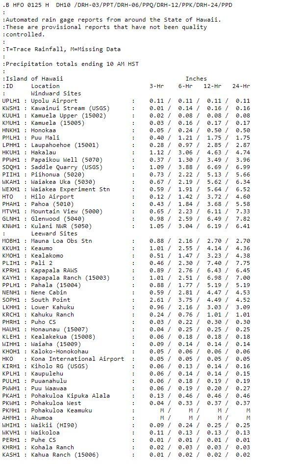 A wet start to the week across Big Island, with rainfall totals pushing 7.5 inches in a couple locations in the last 24 hours. Glenwood and inside the Hawaii Volcanoes National Park have the highest totals so far, with 7.5 inches recorded at both sites. Breakdown as of 10am this morning Location (inches) 3-Hr 6-Hr 12-Hr 24-Hr Glenwood 0.98 / 2.59 / 6.49 / 7.82 Pali (HVNP) 0.46 / 2.30 / 7.40 / 7.75 Mountain View 0.65 / 2.23 / 6.11 / 7.33 Kapapala Ranch 1.01 / 2.51 / 6.98 / 7.00 Saddle Quarry (USGS) 1.09 / 3.88 / 6.69 / 6.99 Waiakea Experiment Stn 0.59 / 1.91 / 5.64 / 6.52 Kulani NWR 1.05 / 3.04 / 6.19 / 6.41 Pahoa 0.43 / 1.84 / 3.68 / 5.58 ... Hilo Airport 0.12 / 1.42 / 3.72 / 4.60 South Point 2.61 / 3.75 / 4.49 / 4.52 Laupahoehoe 0.28 / 0.97 / 2.85 / 2.87 If you keep your own rain gauge and have readings from last night in Hawaii let us know in the comments how much precipitation you got in the last 24 hours.