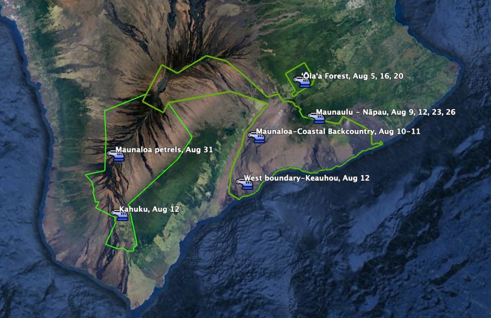 Hawai‘i Volcanoes National Park Public Notice of Flight Operations August 2021 Release Date: August 3, 2021 Hawaii National Park, HAWAI‘I – Hawai‘i Volcanoes National Park announces flight operations for August 2021: August 5, between 9 a.m. and 11 a.m., for fence material sling loads within the ʻŌlaʻa tract between 3,000- and 4,000-ft. elevation. August 9, between 7:30 a.m. and 8:30 a.m., to transport gear (one sling load) from the Maunaulu helispot to Nāpau Crater campground. August 10, between 8 a.m. and noon, for survey and control invasive guinea grass and banana poka, on Mauna Loa and in the coastal backcountry from sea level to 5,000-ft. elevation. August 11, between 8 a.m. and noon, for survey and control of invasive guinea grass and banana poka, on Mauna Loa and in the coastal backcountry from sea level to 5,000-ft. elevation. August 12, between 8 a.m. to 12 p.m. for invasive fountain grass survey and control from the park’s west boundary to Keauhou Trail, from sea level to 3,500-ft. elevation. August 12, between 10:30 a.m. and 11:30 a.m., to transport gear from Nāpau Campground to the Maunaulu helispot. August 16, between 6:30 a.m. and 8:15 a.m., for ungulate surveys and control work in Kahuku between 4,000- to 6,000-ft. elevation. August 16, between 7 a.m. and 9 a.m., for crew support sling loads in ʻŌlaʻa tract between 3,500- and 4,500-ft. elevation. August 20, between 7 a.m. and 9 a.m. for crew support sling loads in ʻŌlaʻa tract between 3,500- and 4,500-ft. elevation. August 23, between 9 a.m. and 10 a.m. to transport gear from the Maunaulu helispot to the Nāpau Crater campground. August 26, between 7 a.m. and 8 a.m. to transport gear from Nāpau Crater to the Maunaulu helispot. August 31, between 7 a.m. and 10 a.m., for ‘uʻau (Hawaiian petrel) monitoring on Mauna Loa, between 8,000- and 9,000-ft. elevation. In addition, the USGS Hawaiian Volcano Observatory may conduct flight operations over Kīlauea and Mauna Loa to assess volcanic activity and maintain instrumentation. The park regrets any noise impact to residents and park visitors. Dates and times are subject to change based on aircraft availability and weather. Management of the park requires the use of aircraft to monitor and research volcanic activity, conduct search-and-rescue missions and law enforcement operations, support management of natural and cultural resources, and to maintain backcountry facilities. www.nps.gov About the National Park Service. More than 20,000 National Park Service employees care for America's 423 national parks and work with communities across the nation to help preserve local history and create close-to-home recreational opportunities. Learn more at www.nps.gov, and on Facebook, Instagram, Twitter, and YouTube. [Map by Hawaiʻi Tracker using Google Earth showing interpreted locations.] [Photo: USGS helicopter sling-load in the Everglades, credit Paul Nelson]