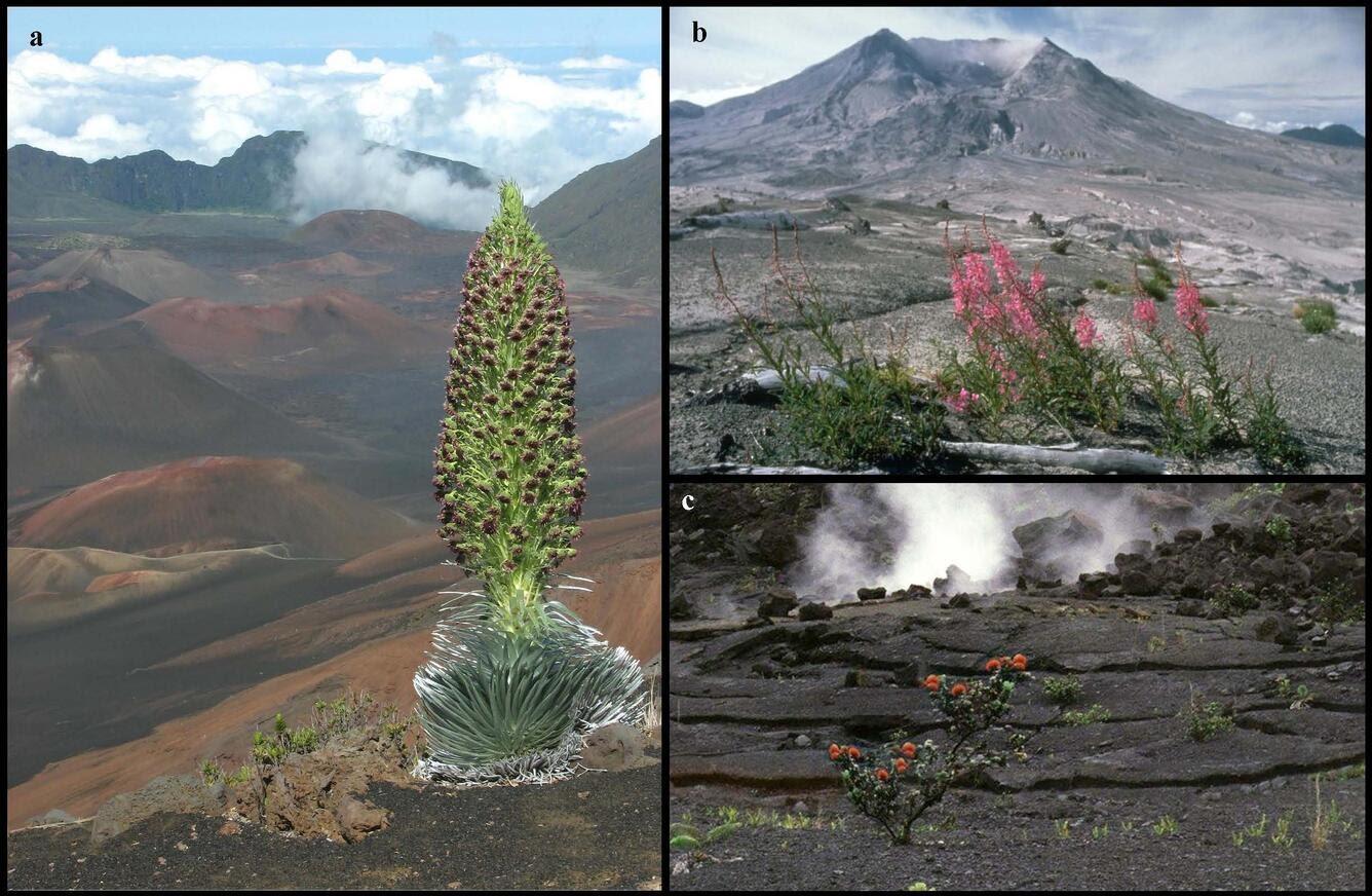 Earth Day (https://www.earthday.org/) was first established on April 22, 1970, to raise awareness of some of the harmful effects industrialization was having on the environment. It has since become the largest secular observance on the planet. Participating in Earth Day (https://www.earthday.org/take-action-now/) can be as simple as remembering to turn off the light when you leave a room or as involved as advocating for legislative change. Many people use Earth Day as an opportunity to educate themselves on their own personal carbon footprint (https://www3.epa.gov/carbon-footprint-calculator/). But have you ever thought about how natural events influence environmental change? For example, you probably won’t see any thriving vegetation immediately following a volcanic eruption. Depending on the scale of the eruption, the surrounding flora and fauna have probably been devastated by some combination of ash, volcanic gas, lava, or lahars. The resulting landscape seems inhospitable at first, but over time the volcanic deposits break down and release nutrients on which plants thrive. On the windward and wet east side of the Island of Hawai‘i, the substantial rainfall drives faster rates of plant growth, meaning the region can go from a barren and young lava flow to a thriving rainforest in under 150 years! Volcanic influence isn’t limited to the nearby ground surface. Ash plumes from large explosive eruptions can temporarily block out the sun, turning the clearest day into the darkest night. The darkness can last from hours to days, or until most of the ash particles make their way back down to Earth’s surface. However, the smallest particles remain suspended high in the atmosphere, carried by wind currents for thousands of kilometers or miles. You can think of these particles as trillions of tiny mirrors reflecting solar radiation back into space. Sulfur dioxide, a volcanic gas, combines with water droplets in the atmosphere and blocks solar radiation in the same way. Large volcanic eruptions can block so much solar radiation in this way that they briefly impact the climate. The 1883 eruption of Krakatoa in Indonesia, one of the largest eruptions in recent history, plunged the region into total darkness for two and a half days and lowered global temperature for five years. An even larger eruption from Mount Tambora in 1815 resulted in “the year without summer” across Europe and North America. However, global cooling brought on by volcanic eruptions is only temporary and isn’t a solution to the current climate change crisis our planet is currently experiencing. Volcanoes also regularly emit greenhouse gases into the atmosphere, but it is unlikely that we would notice any significant rise in global temperatures due to a single volcanic eruption. For that, we’d have to look back millions of years to volcanic events like those that created the Siberian Traps. These were large-scale eruptions that spanned millions of years and spewed enormous amounts of lava across Siberia. The resulting lava flows are known as flood basalts. They are made up of numerous and extensive lava flows stacked on one another. Flood basalt flows are very fluid and travelled very far from their source vents. The Siberian Traps eruption caused the largest identified mass extinction event on Earth. Emissions of volcanic gases were a major contribution to the extinction event, but the magma also ignited huge underground coal deposits that released vast amounts of carbon dioxide (CO2) and other greenhouse gases. Sound familiar? Today, human activities annually produce more than 100 times the greenhouse gas emissions than global volcanism (https://www.usgs.gov/programs/VHP/volcanoes-can-affect-climate). In other words, Mount St. Helens would have to erupt over 3,500 times a year to match human CO2 emissions. So, do volcanoes influence our local environment and global climate? Absolutely! But we shouldn't blame them for or rely on them to solve our current climate woes. This Earth Day, April 22, whether you are admiring the eruption glow from Halema‘uma‘u at the summit of Kīlauea or just remembering to turn off the light when you leave a room, we hope you take a moment to appreciate planet Earth. --- Volcano Watch is a weekly article and activity update written by U.S. Geological Survey Hawaiian Volcano Observatory scientists and affiliates. --- Images and captions from USGS: a) Haleakalā Silversword growing on the edge of Haleakalā Crater (approximately 410–530 years post-eruption). Photo by Paul Krushelnycky. b) Fireweed growing on the slopes of Mount St. Helens (five years post-eruption). Photo by Lyn Topinka. c) A blooming ‘ōhi‘a tree growing on what used to be the Kīlauea Iki lava lake (56 years post-eruption). Photo by Nate Yuen