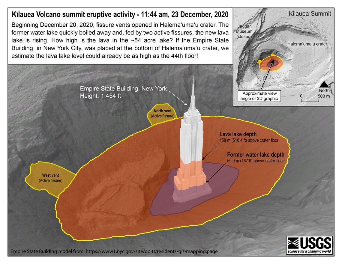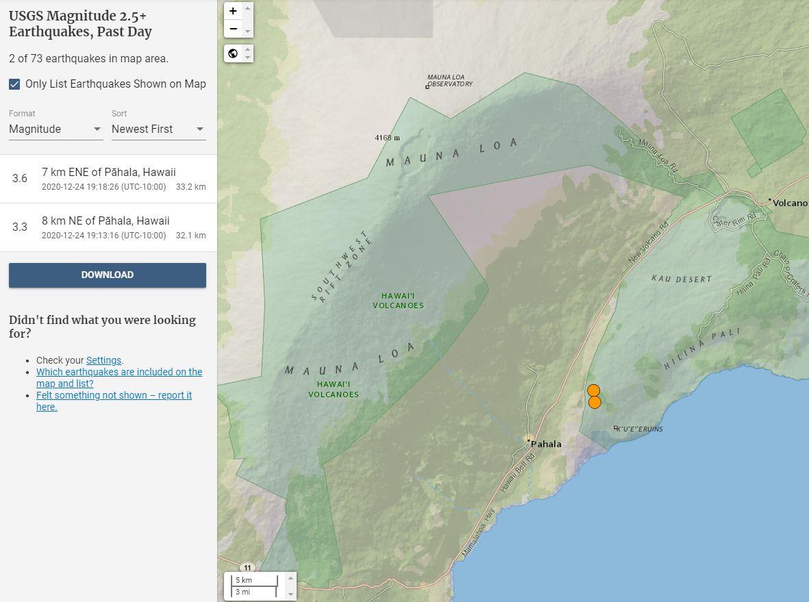 The eruption inside of the Halema’uma’u Crater continues this Christmas Eve. Activity remains focused at two fissures on the walls of the steep crater leading down to the rising lava lake contained inside the collapse pit formed in 2018. The northern most predominant eruptive vent was submerged in lava over the course of the last 24 hours, while the western vent shows only intermittent activity and is still above the pooled lava. As of this morning, the depth of the lava lake is now 554 feet deep (169m) - increasing almost 40ft in 24 hours. USGS suggests that when the eruptive vents are submerged there is no change in volcanic hazard expected. Gas Emissions - Sulfur dioxide and other volcanic emissions from the eruption site have returned vog to many downwind areas that saw a reprieve following the 2018 eruption. SO2 levels measured by USGS-HVO are around 35,000-40,000 tonnes per day in the most recent samples. For comparison sake, at the height of Fissure 8 during the 2018 eruption the SO2 emissions were over 100,000 tonnes per day. LERZ - No notable changes along the Lower East Rift Zone and the 2018 eruption sites. Pahala Earthquakes - At 6:12pm HST this evening two magnitude 3.8 and M3.3 earthquakes at a depth of roughly 33km near Pahala occurred separated by 5 minutes. Earthquakes in this area at that depth have been fairly elevated over the last year, but there is not any correlation between earthquakes in this region and short term changes on Kīlauea. Seismologists and geophysicists we have spoken with previously suggest that this general area of Pahala and the deep earthquake activity is associated with the supply of magma from the depth of the mantle plume that ultimately supplies lava to the volcano. Even during elevated earthquake activity periods around Pahala, it is not considered unusual and the earthquakes are very deep. USGS-HVO Volcano Watch: Volcano Advisory Level - At the time of the onset of the Dec 20th eruption the USGS volcano alert-level was reading GREEN/ NORMAL background levels of activity, although an injection of magma had occurred weeks earlier on Dec 2nd. In today’s Volcano Watch USGS address the sudden rise of the alert-level and aviation color codes from NORMAL/GREEN up to RED/WARNING, skipping both YELLOW and ORANGE. This week’s Volcano Watch addresses what happened, and how this eruption was on the sneaky side. Volcano Watch: https://www.hawaiitracker.com/posts/5fe5825f8e22600004c0a79e
