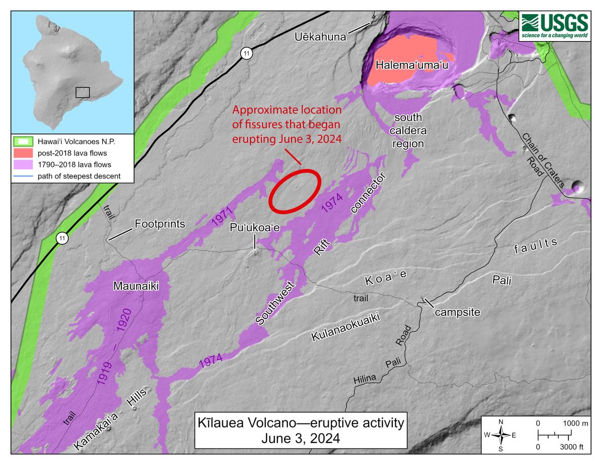 Kīlauea volcano is erupting as of 12:30am HST June 3, 2024, with the alert level raised to WARNING and the aviation color code to RED. Lava is erupting from fissures south of Kīlauea caldera within Hawai'i Volcanoes National Park. Activity is already beginning to wane. According to USGS Volcanoes, "(the last eruption in this area, in December 1974, only lasted 6 hours)." HVO/USGS Volcanic Activity Notice Volcano: Kilauea (VNUM #332010) Current Volcano Alert Level: WARNING Previous Volcano Alert Level: WATCH Current Aviation Color Code: RED Previous Aviation Color Code: ORANGE Issued: Monday, June 3, 2024, 2:11 AM HST Source: Hawaiian Volcano Observatory Notice Number: 2024/H167 Location: N 19 deg 25 min W 155 deg 17 min Elevation: 4091 ft (1247 m) Area: Hawaii Volcanic Activity Summary: Kīlauea volcano is erupting. A new eruption began at approximately 12:30 a.m. HST on Monday, June 3, likely about a mile (1-2 km) south of Kīlauea caldera and north of the Koa'e fault system and Hilina Pali Road, within Hawai'i Volcanoes National Park. Accordingly, the USGS Hawaiian Volcano Observatory (HVO) is raising the Volcano Alert Level for ground-based hazards from WATCH to WARNING and the Aviation Color Code from ORANGE to RED. Glow is visible in webcam imagery, indicating that lava is currently erupting from fissures. The most recent eruption in this region was during December 1974, which lasted only about 6 hours. At this time, it is not possible to say how long the eruption will last. HVO continues to closely monitor Kīlauea for signs of increasing or decreasing activity. Should volcanic activity change significantly, a new Volcanic Activity Notice will be issued. Hazards are present on Kīlauea and are described below. Residents and visitors should stay informed and follow County of Hawai‘i and Hawaiʻi Volcanoes National Park guidelines. Rates of seismicity and ground deformation beneath the East Rift Zone and Southwest Rift Zone remain low. Current activity is restricted to the summit region. For more information about the meaning of volcano alert levels and aviation color codes, see https://www.usgs.gov/programs/VHP/volcanic-alert-levels-characterize-conditions-us-volcanoes Here is a live web camera showing the current eruption: https://www.usgs.gov/observatories/hawaiian-volcano-observatory/kpcam-kilauea-summit-mauna-loa-strip-road