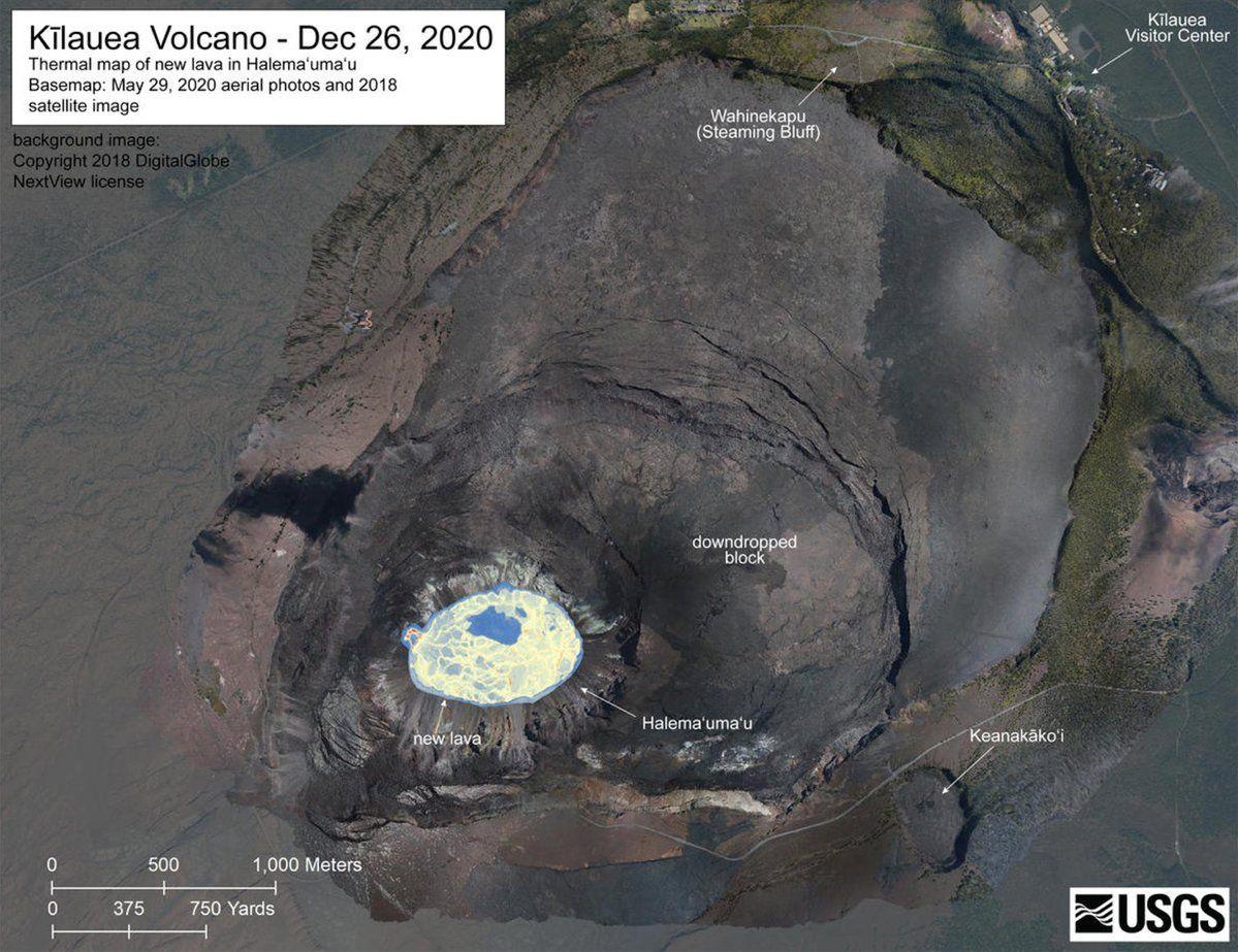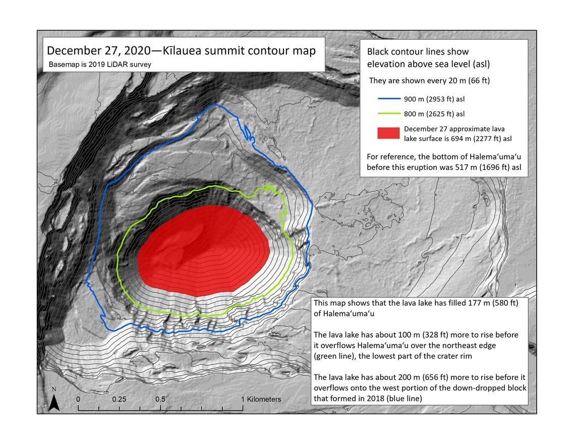 Latest USGS thermal map of Kīlauea and the Halema'uma'u Crater lava lake, Sunday’s eruption images, and continued decrease in SO2 emissions. Two maps released by USGS. Measurements taken this morning by USGS shows very little change in the depth of the lava lake in the last 24 hours. The depth of the lake is now at 581 feet deep. The western eruptive vent has reduced activity from yesterday, coinciding with another large cut in volcanic emissions, dropping from ~40,000 tonnes per day at the height of the eruption, down to ~20,000 tonnes on Christmas night, and dropping further to 5,000 tonnes per day recorded last night. The previous predominant northern fissure on the crater wall of Halema’uma’u remains inactive this morning. No seismic or deformation indication of activity moving towards the rift zones currently. Images and captions from USGS (captions in the order image appear): - Image 1: A helicopter overflight yesterday (Dec. 26, 2020) at approximately 9:30 AM HST allowed for aerial visual and thermal imagery to be collected of the new eruption within Halema'uma'u crater at the summit of Kīlauea Volcano. This preliminary thermal map shows that the new lava lake is 790 m (864 yd) E-W axis and 520 m (569 yd) in N-S axis. The most recent estimate of lake area is about 29 hectares (72 acres). The scale of the thermal map ranges from blue to red, with blue colors indicative of cooler temperatures and red colors indicative of warmer temperatures. A new observation of the lava lake yesterday is visible in this thermal image as a blue ring at the intersection of the lava lake and surrounding crater wall, indicating cooler temperatures around the perimeter of the lake. The lake was surrounded by a narrow (extending out 10-30 m or 11-22 yd) ledge that is cooler than the rest of the lake. This suggests that the lake level had recently dropped slightly. The ledge was perhaps 1-2 m (1-2 yd) above the fluid lake level. USGS map by M. Patrick. - Image 2: Kīlauea summit KW webcam image taken on December 27, 2020, just after 6:30 a.m. HST. The eruption in Halemaʻumaʻu continues and this photo shows that activity remains focused at the west vent as of Dec. 27 morning. You can view live KW webcam images here. USGS photo. - Image 3: HVO field crews were unable to observe early morning eruption activity in Halema‘uma‘u crater at Kīlauea's summit due to high winds. Upon return to the eruption site this morning, HVO field crews noted the reduced vigor at the western vent. The northern/eastern vent remains inactive. At approximately 7:30 a.m. HST today (Dec. 27), HVO field crews measured the lava lake as 177 m (581 ft) deep. The lava lake level has not changed significantly over the past 24 hours. USGS photo by M. Patrick - Image 4: This map of Halema‘uma‘u at Kīlauea's summit shows 20 m (66 ft) contour lines (black) that mark locations of equal elevation above sea level (asl). The map shows that the lava lake (approximate outline marked in red) has filled 177 m (580 ft) of Halema‘uma‘u since the eruption began at approximately 9:30 p.m. HST on December 20, 2020 (nearly one week ago). The lava lake has about 100 m (328 ft) more to rise before it overflows Halema‘uma‘u crater rim on the lowest part at the northeast edge (green line). The lava lake has about 200 m (656 ft) more to rise before it overflows onto the west portion of the down-dropped block that formed in 2018 (blue line). For reference, the bottom of Halema‘uma‘u before this eruption was 517 m (1696 ft) asl. Initially, the lava lake was rising several tens of meters (yards) per day; however, the lava lake level has not risen significantly over the past day. USGS map.