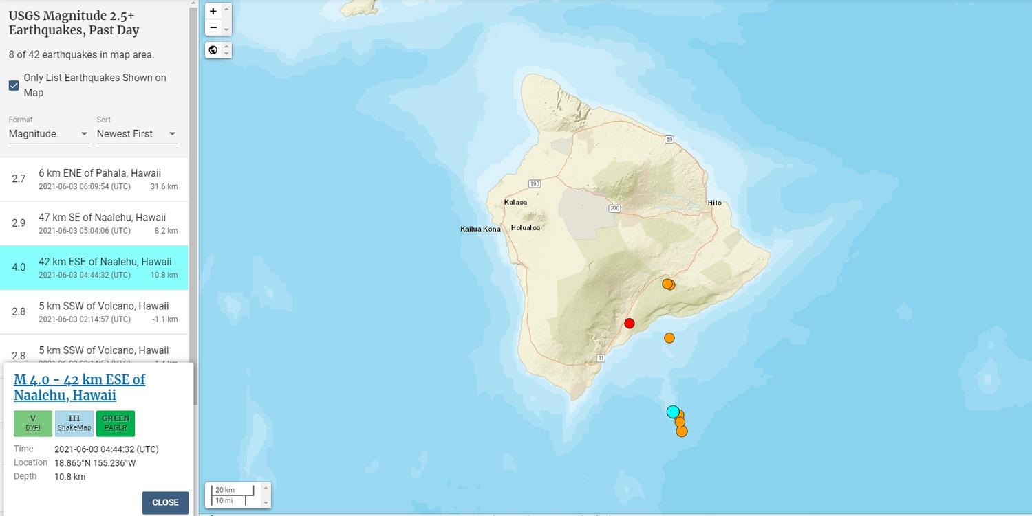 The U.S. Geological Survey's Hawaiian Volcano Observatory (HVO) recorded a magnitude-4.0 earthquake located beneath Lō‘ihi seamount on Wednesday, June 2, at 6:44 p.m., HST. The earthquake was centered about 42 km (26 miles) southeast of Nāʻālehu, under Lō‘ihi seamount at a depth of 11 km (7 miles). A map showing its location is posted on the HVO website at https://www.usgs.gov/observatories/hawaiian-volcano-observatory/earthquakes. More details are available at the National Earthquake Information Center website at https://earthquake.usgs.gov/earthquakes/eventpage/hv72502537/. Moderate shaking, with maximum Intensity of V on the Modified Mercalli Intensity Scale, has been reported across the Island of Hawai‘i. At that intensity, significant damage to buildings or structures is not expected. The USGS "Did you feel it?" service (http://earthquake.usgs.gov/dyfi/) received 3 felt reports within the first hour of the earthquake. According to HVO Scientist-in-Charge Ken Hon, the earthquake had no apparent effect on Kīlauea or Mauna Loa volcanoes. “We see no detectable changes in activity at the summits or along the rift zones of Lōʻihi, Kīlauea, or Mauna Loa as a result of this earthquake. Aftershocks are possible and could be felt.” HVO continues to monitor Kīlauea, Mauna Loa, and other Hawaiian volcanoes for any changes. Lōʻihi seamount is an active volcano on the seafloor south of Kīlauea Volcano, about 30 km (19 miles) from the shoreline of the Island of Hawaiʻi. The top of the seamount is about 975 m (3,199 feet ) below sea level. The volcano consists of a broad summit area marked by three pit craters and two prominent rift zones extending from the summit about 22 km (13.6 mi) south-southeast and about 15 km (9.3 mi) north-northeast. The volcano likely has a shallow magma chamber between 1 to 2.5 km (0.6 to 1.6 mi) deep below the summit. For information on recent earthquakes in Hawaii and eruption updates, visit the USGS Hawaiian Volcano Observatory website at https://www.usgs.gov/hvo. Background: Intermittent earthquake activity has been recorded in the vicinity of Lō‘ihi since as early as 1952. The most energetic earthquake sequence occurred in July-August 1996, which included more than 4,000 earthquakes, with nearly 300 events larger than M3.0 and 95 events in the M4.0 to 4.9 range. More recently, a swarm of 100 earthquakes occurred on May 11, 2020, with 18 events in the M3.0 to 3.9 range. There are no working monitoring instruments on Lō‘ihi Volcano, whose peak is about 1,000 m (3,280 ft) below sea level. All real-time information about the volcano is derived from land-based seismometers on the Island of Hawai‘i. More Information: Lō‘ihi Seamount website: https://www.usgs.gov/volcanoes/loihi-seamount