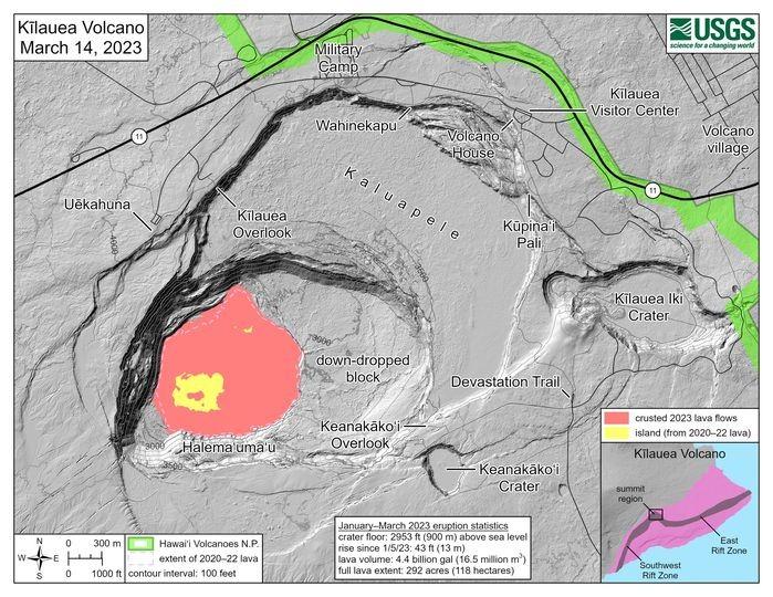 Since Tuesday, March 7, 2023, the Kīlauea summit eruption has been paused. This USGS-HVO reference map illustrates the current non-eruptive conditions of the Halema‘uma‘u crater floor. "Over the course of the eruption, the crater floor rose an average of 43 feet (13 meters) to a new volume-averaged elevation of 2,953 feet (900 meters) above sea level. The full extent of new lava from the eruption is 292 acres (118 hectares)" ~ USGS